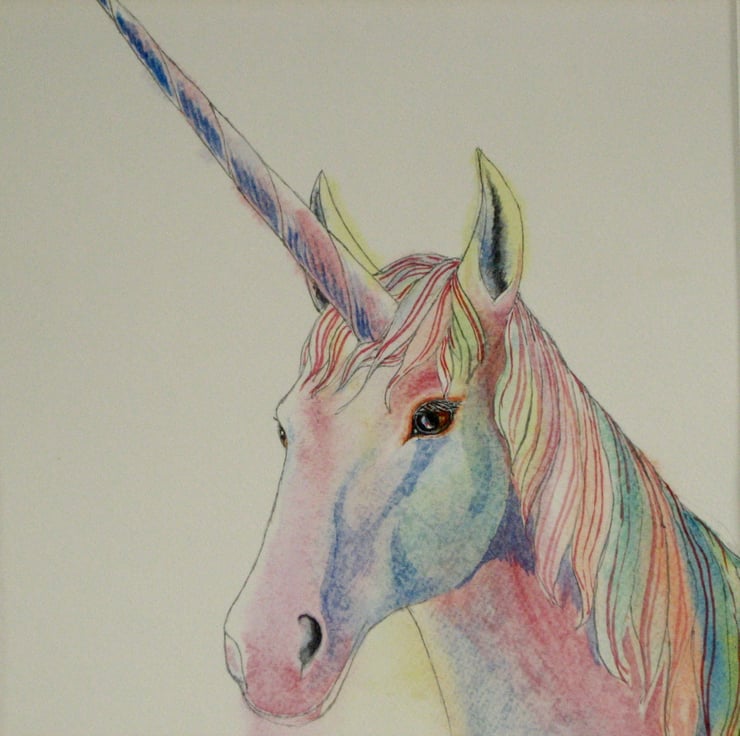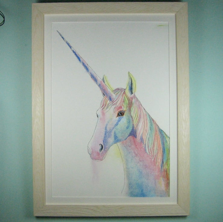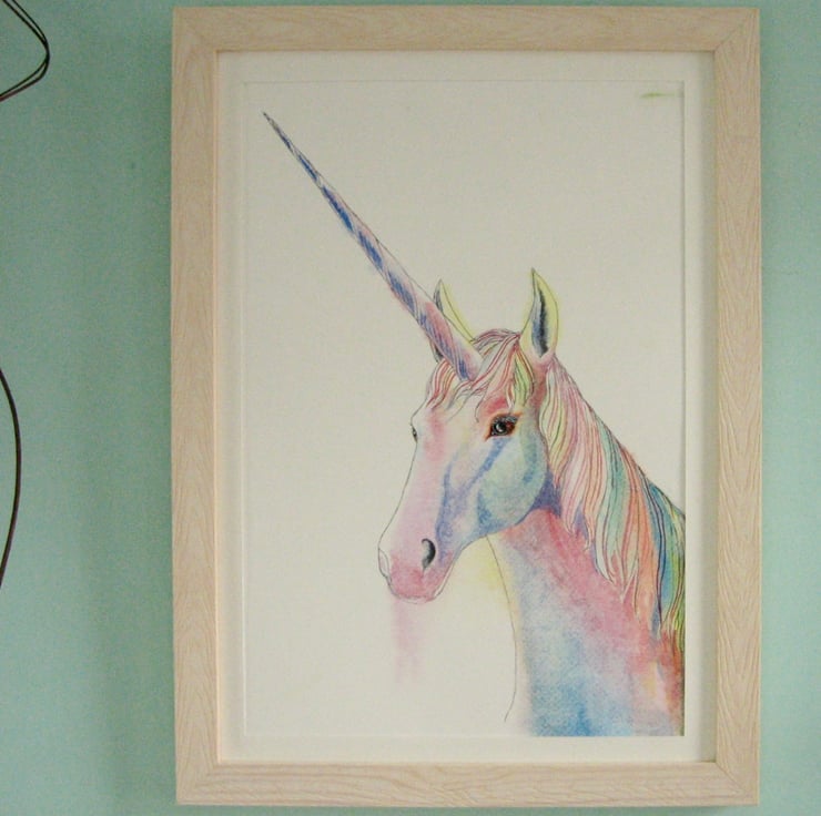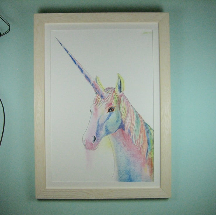 A unicorn painted in watercolour on good quality textured paper. Slightly smaller than A3, this original picture has been window mounted in paper to fit into a standard size A3 frame.