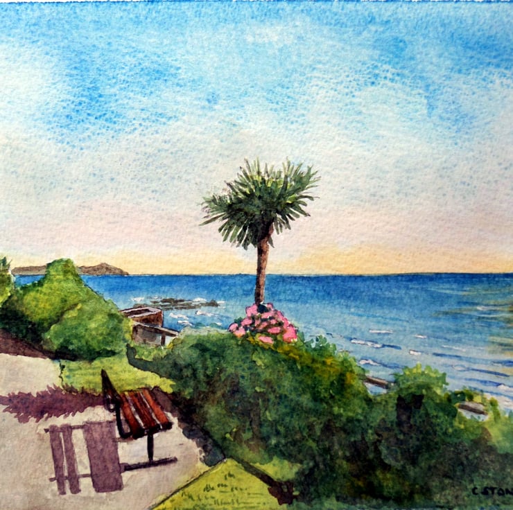 My original small watercolour of the charming coastal village of Downderry, near my home in Liskeard, Cornwall. From my own photographs, this view was taken in the wonderfully named "Garden of Kink", overlooking the sea, towards distant Rame Head.