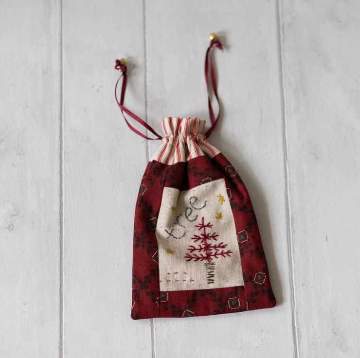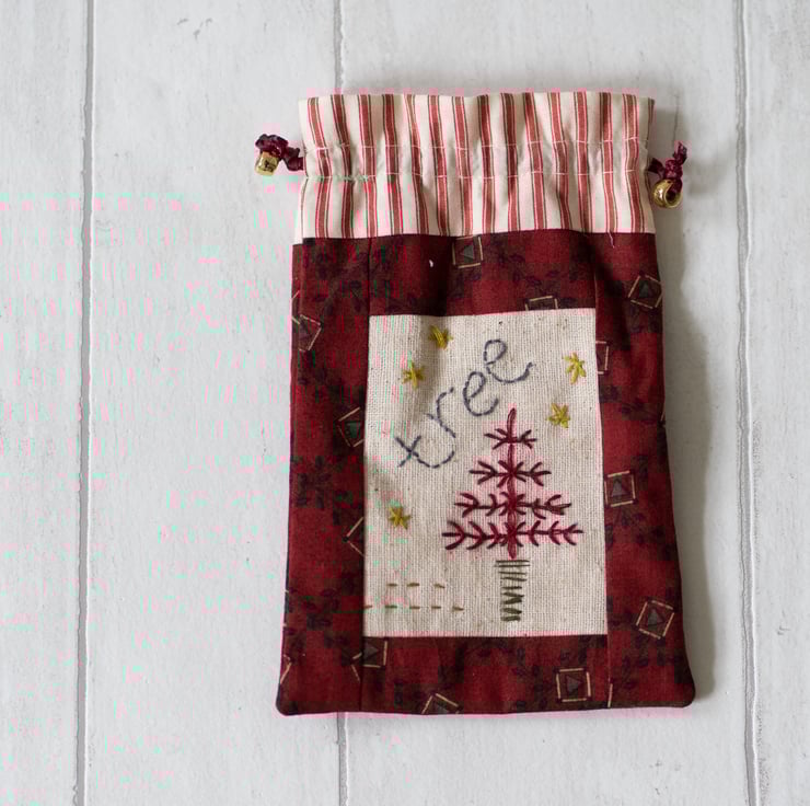 Pretty little one off hand embroidered Christmas gift bag featuring stars and a Christmas tree.
