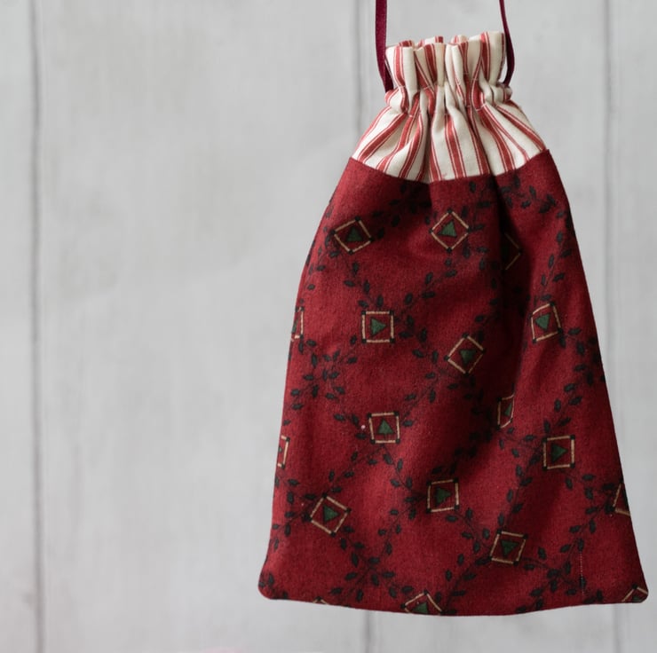 This bag has a red ticking look lining and the main body of the bag is a co-ordinating red Christmas tree design.
