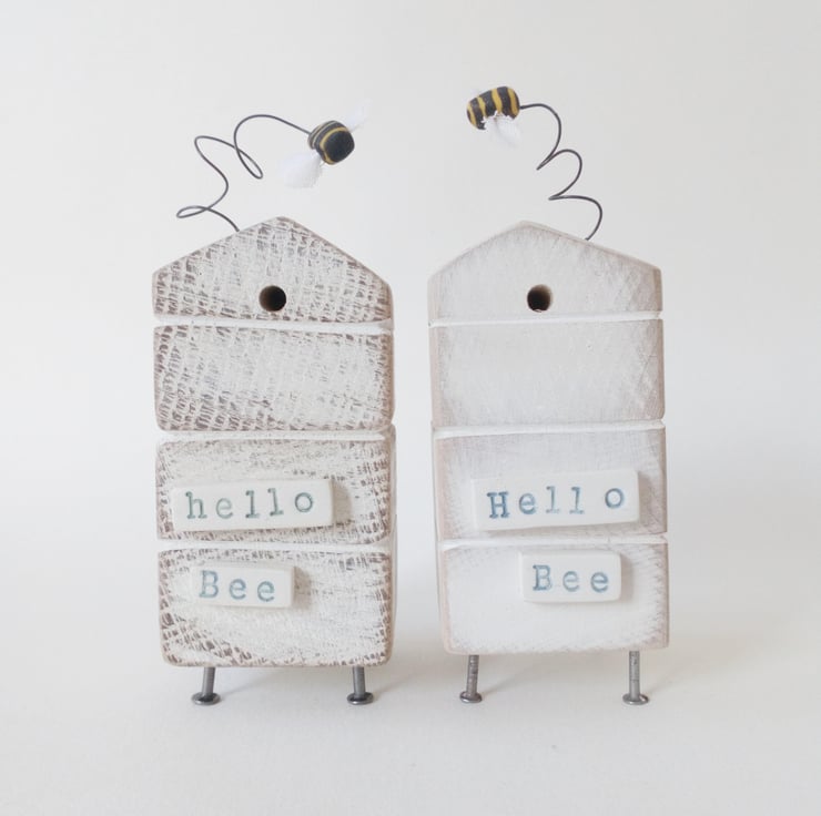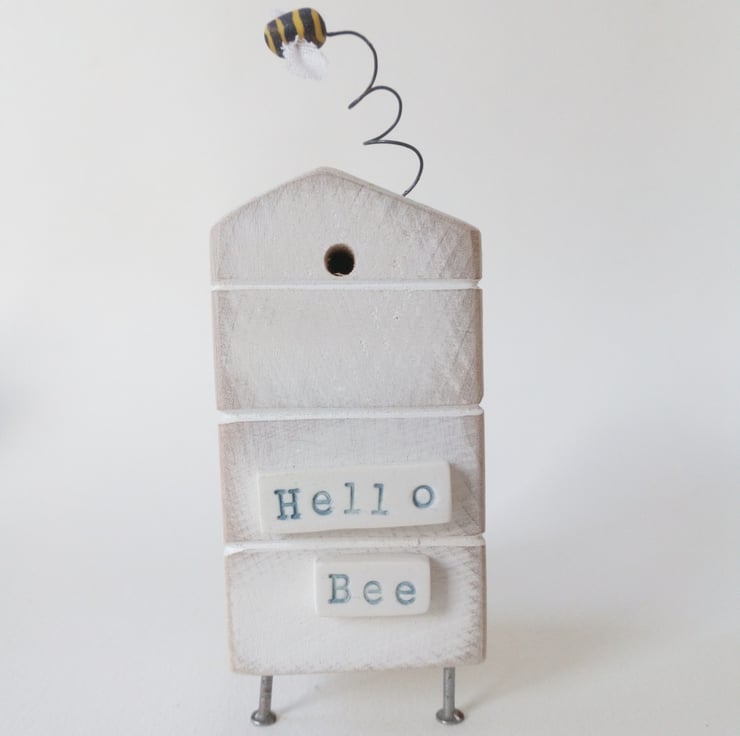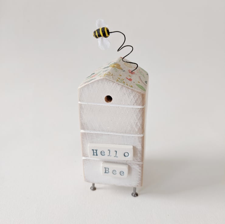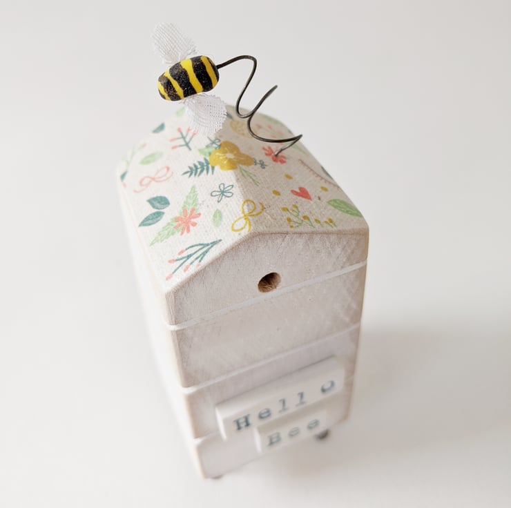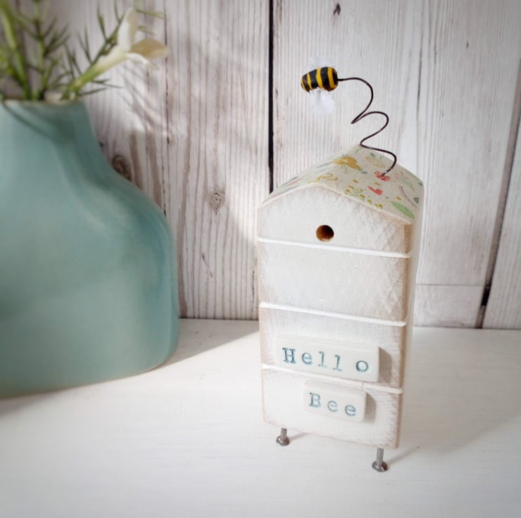 Painted white and sanded smooth the roof of the hive is adorned with flowers and the little bee dances on a bendy wire. The sign on the front reads 'Hello Bee' and is made from polymer clay which is shaped, fired and painted as is the bee with the tiniest fabric wings to finish.