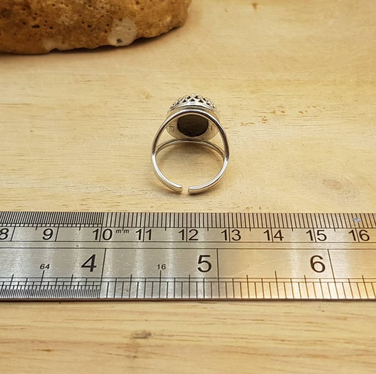 Sterling silver ring is adjustable so should fit most ring sizes.