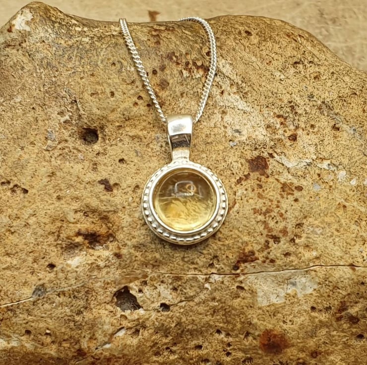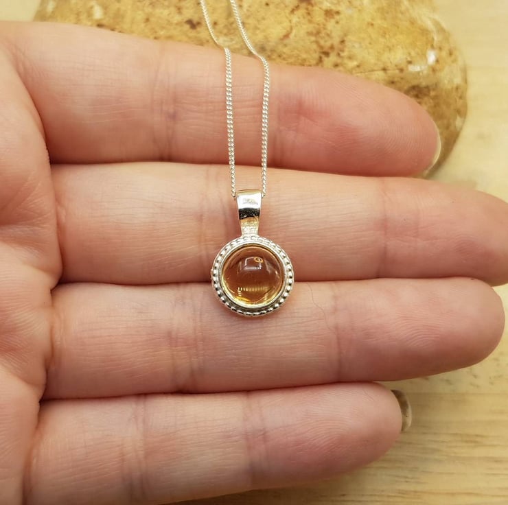 This is a women's tiny minimalist Sterling Silver Citrine circle pendant necklace with studded edge.