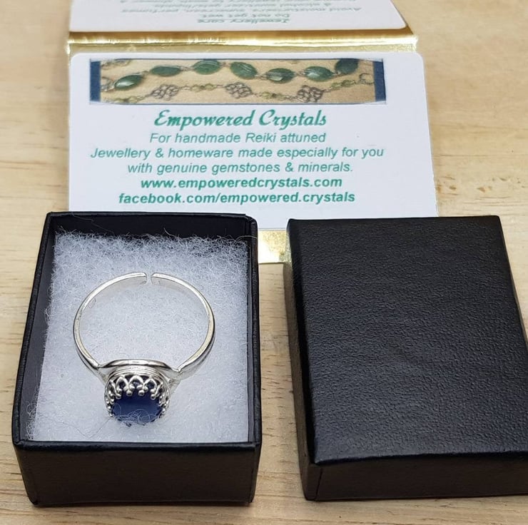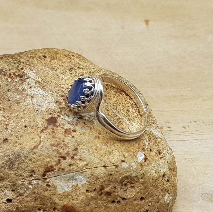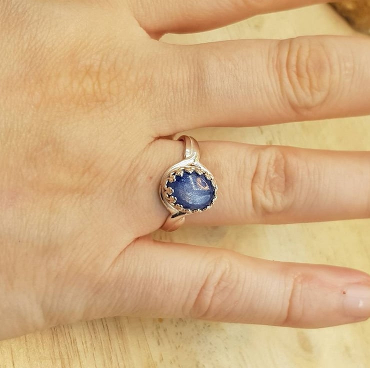 This is a women's lightweight sterling Silver oval Kyanite adjustable ring with crown edging.