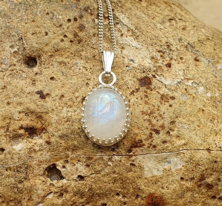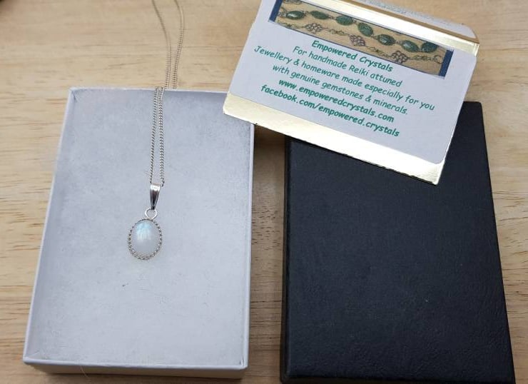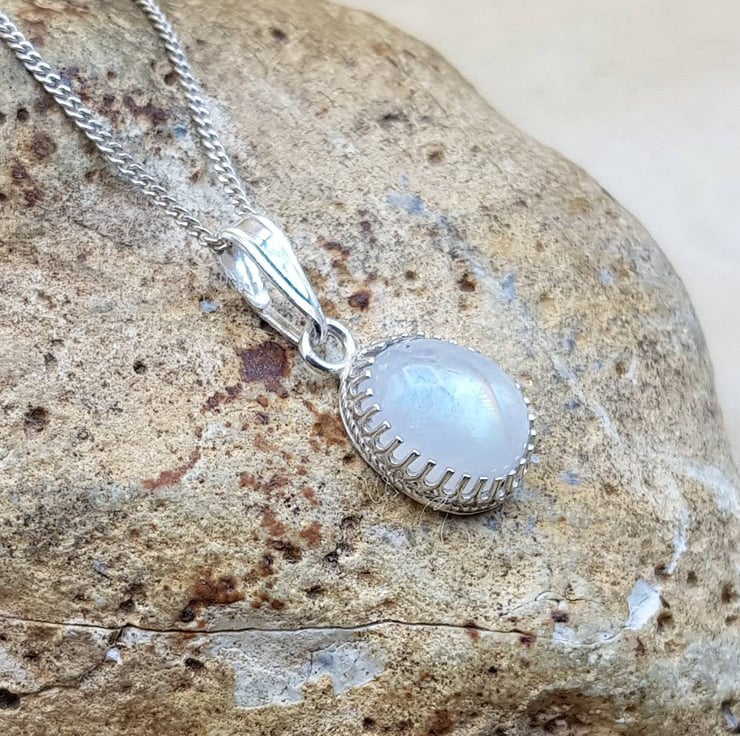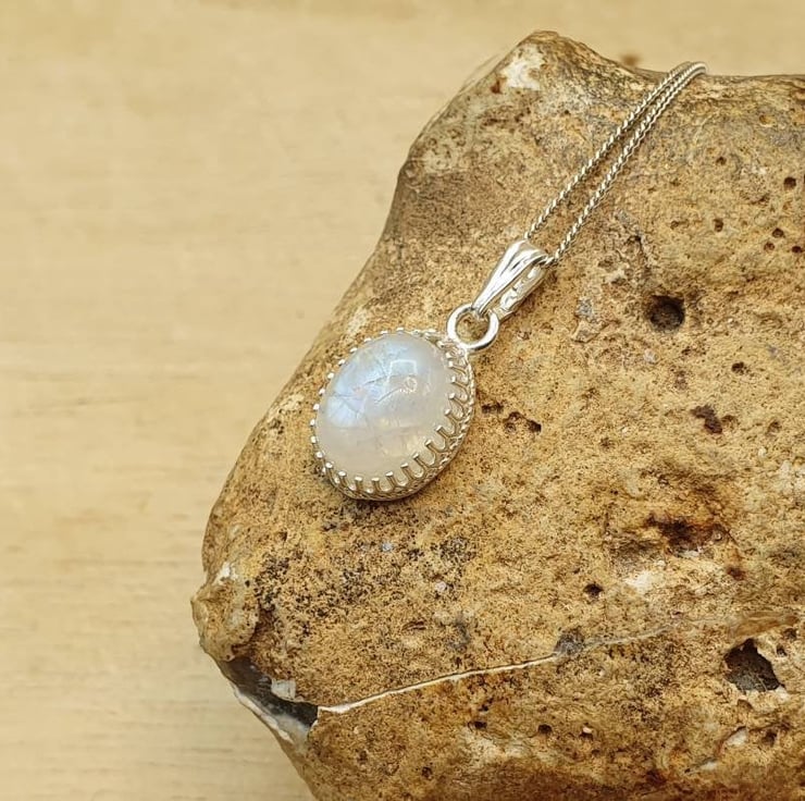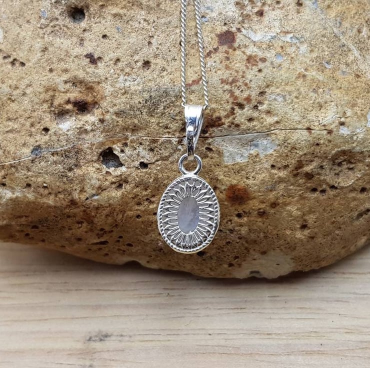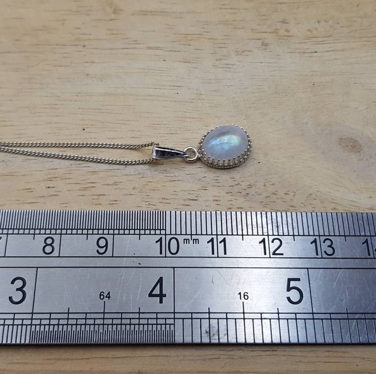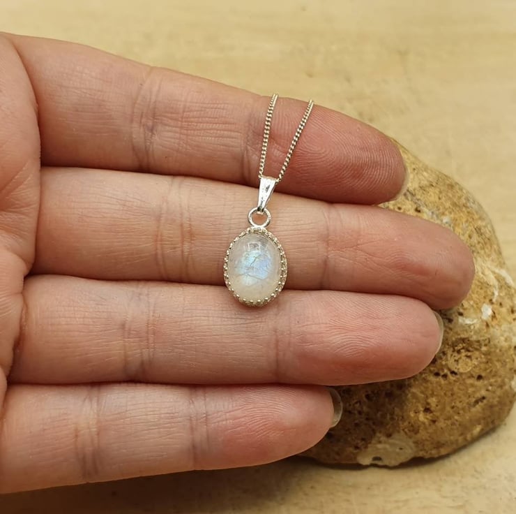 This is a tiny, delicate sterling silver Rainbow Moonstone oval Pendant Necklace.