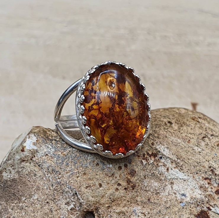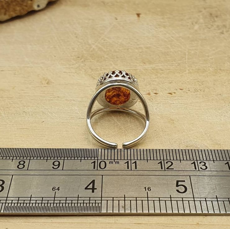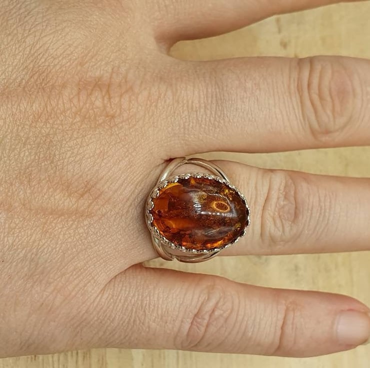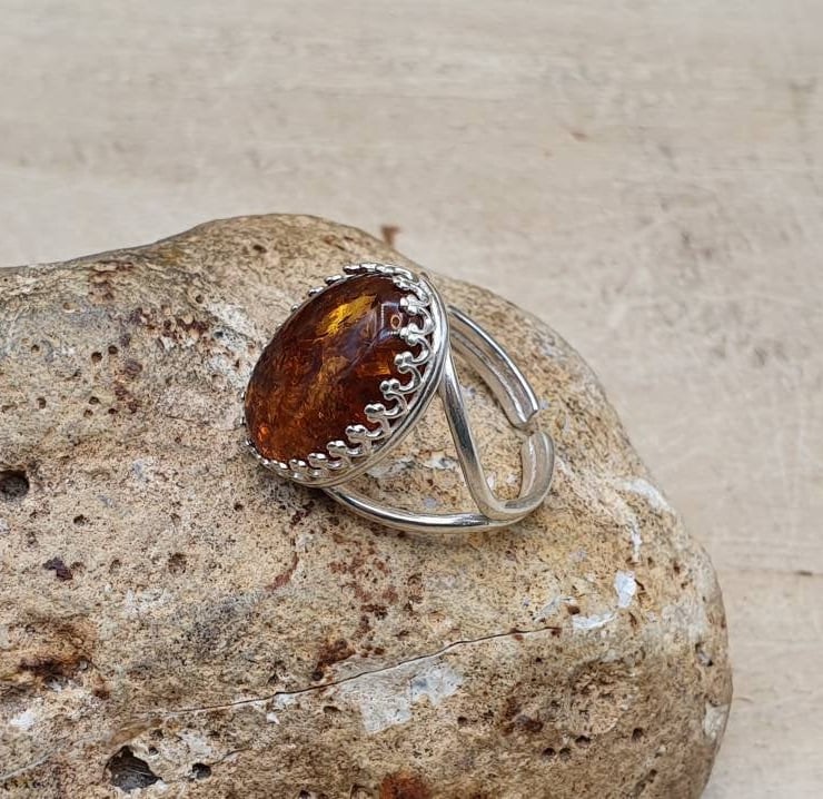 This is a women's sterling silver Russian pressed amber adjustable ring.