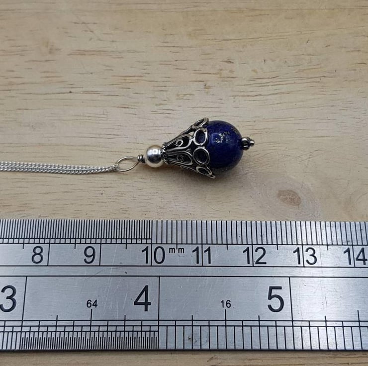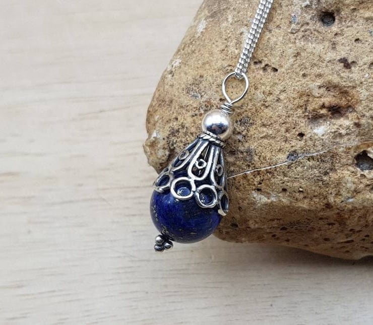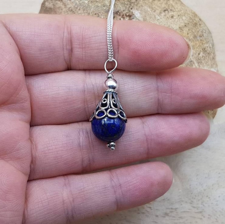 This is a small, delicate sterling silver Lapis Lazuli angel pendant necklace. Bali Silver beads are handmade beads by the world renown silversmiths of Bali. Bali up to 99% Silver but is not hallmarked or stamped.