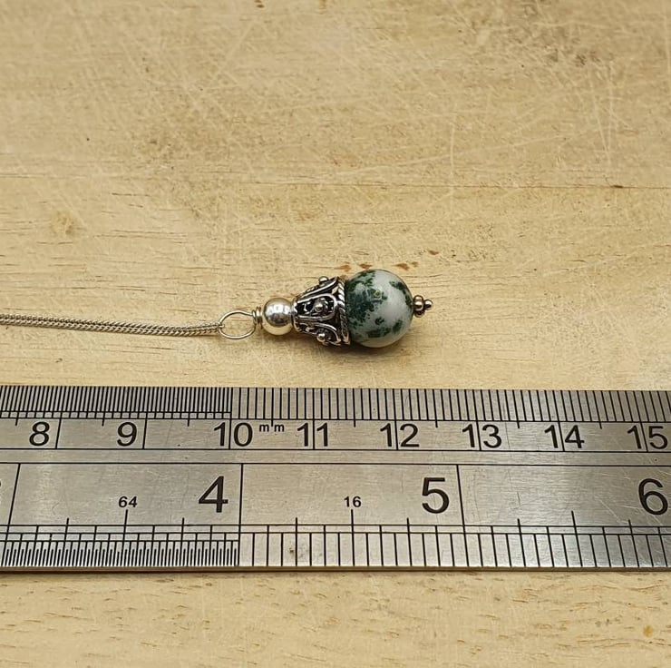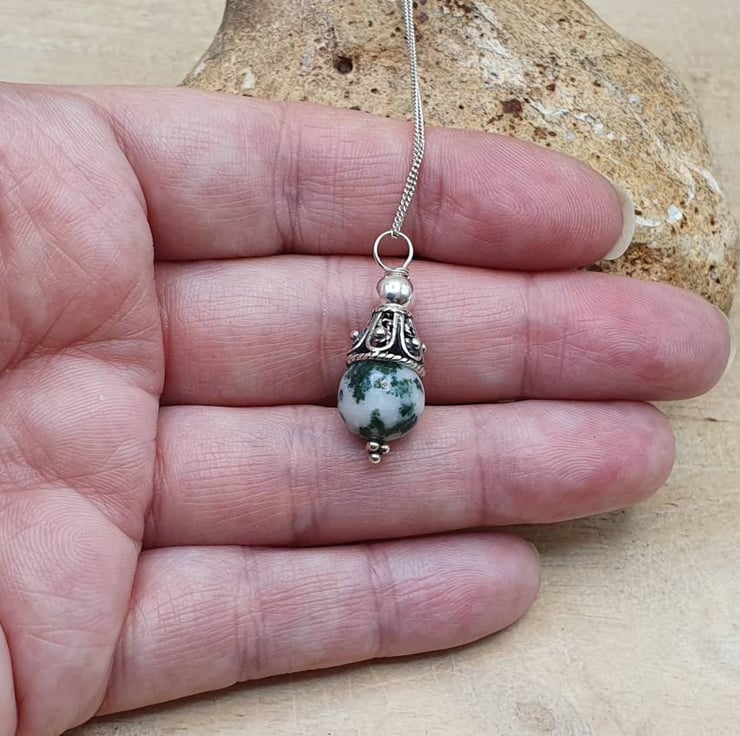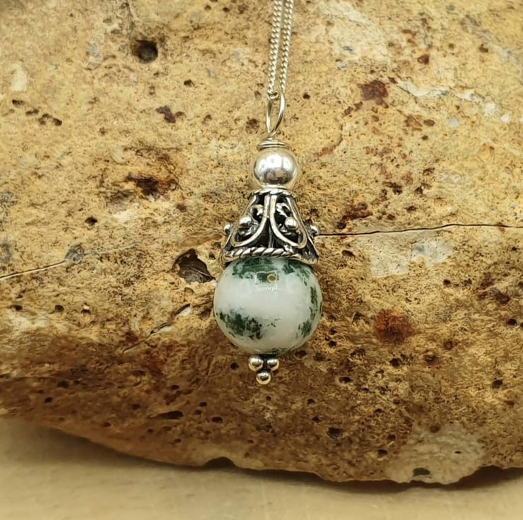 This is a Bali silver tree agate pendant necklace, with Bali silver beads which are handmade beads by the world renown silversmiths of Bali that contain up 99% silver. Bali Silver is not hallmarked or stamped.