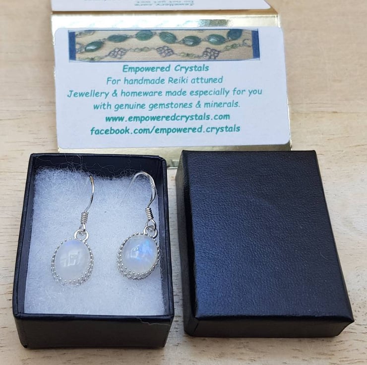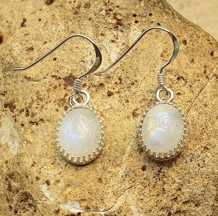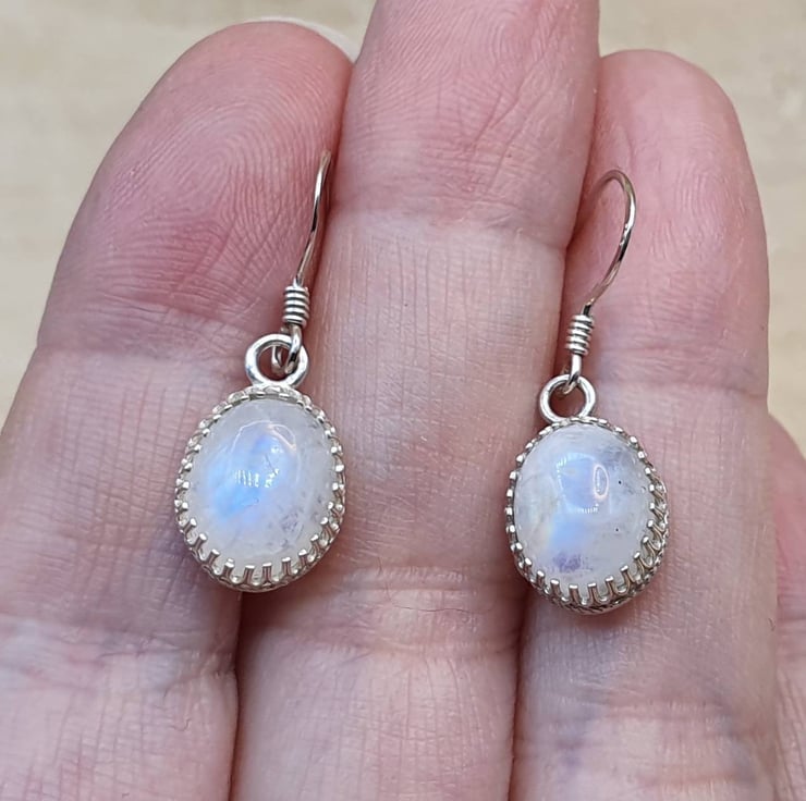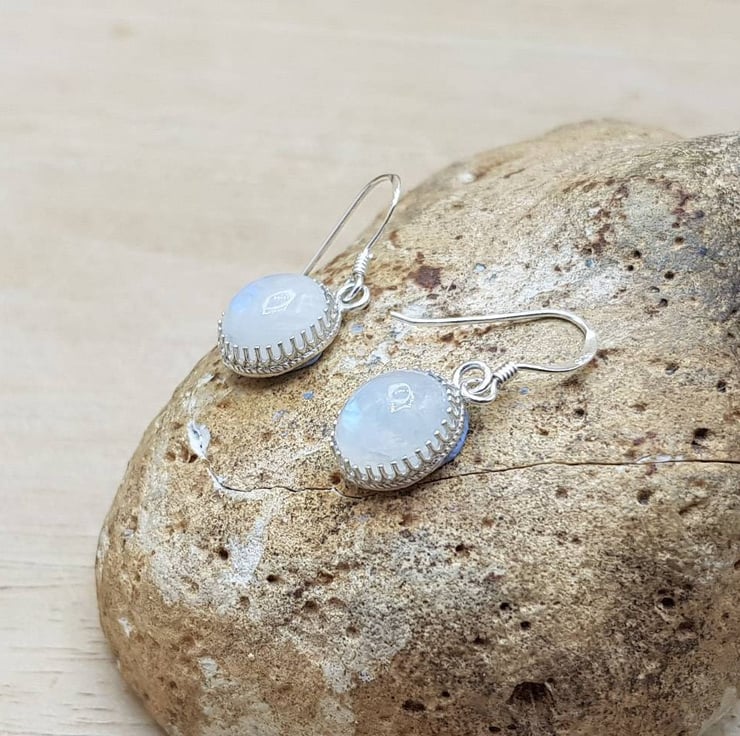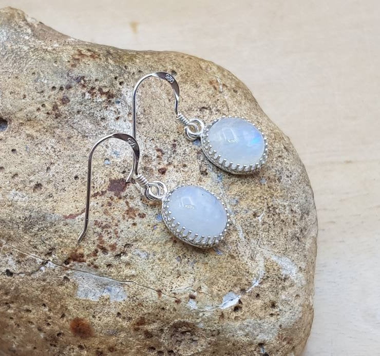 These are women's simple minimalist sterling silver rainbow moonstone oval drop dangle earrings. Stones will vary from the photos.