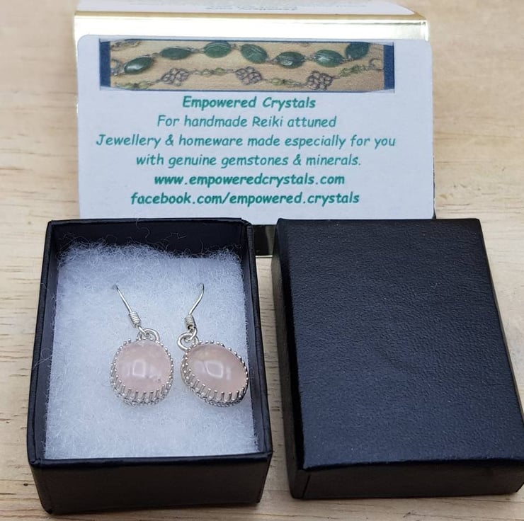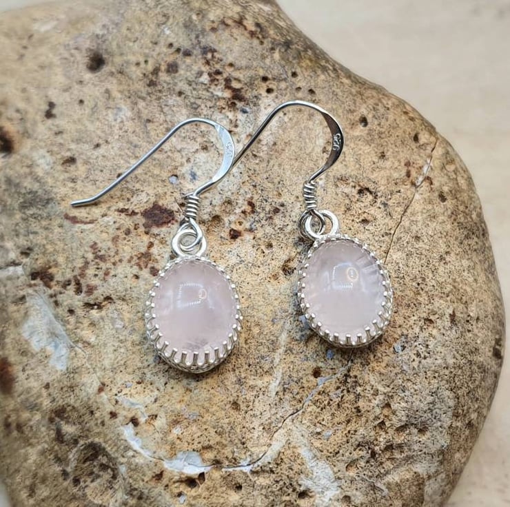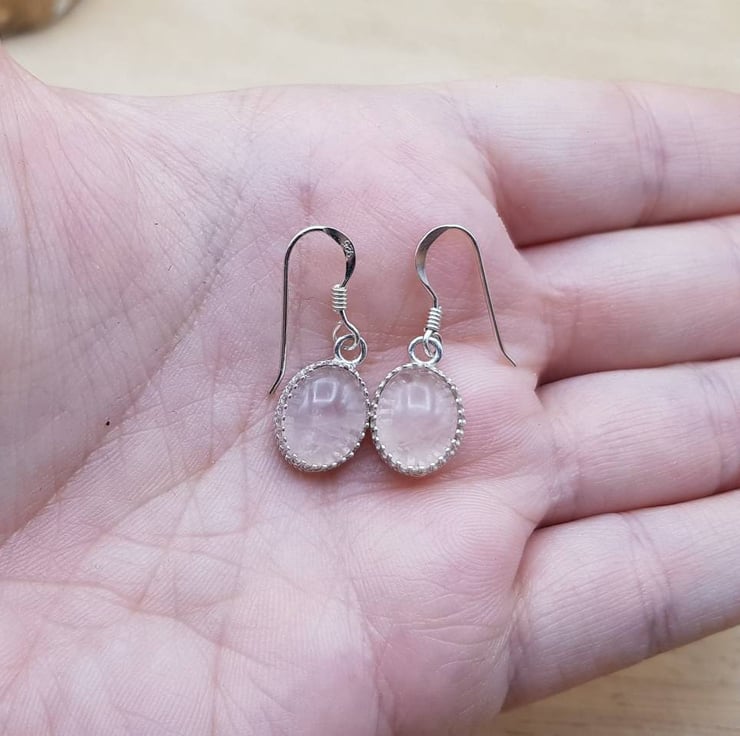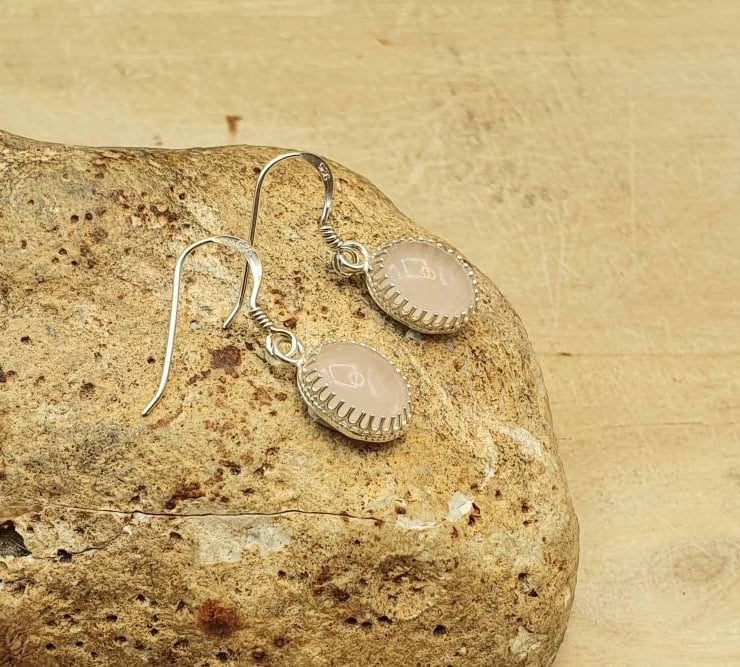 These are women's simple sterling Silver oval Rose Quartz drop dangle earrings.