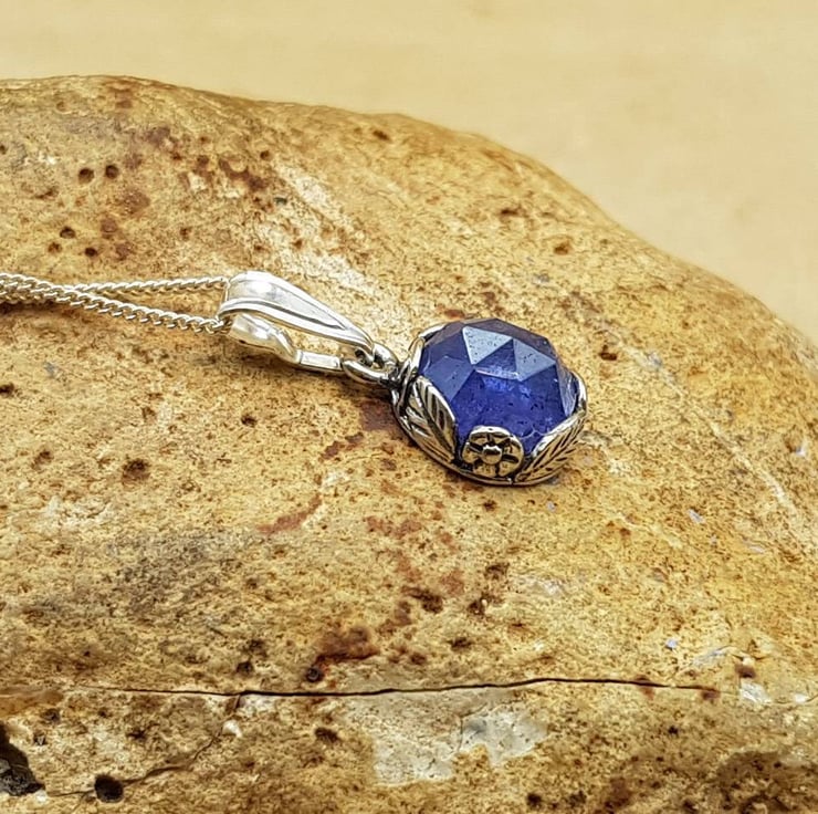 This is a tiny sterling silver genuine Tanzanite pendant with leaf detail on sides.