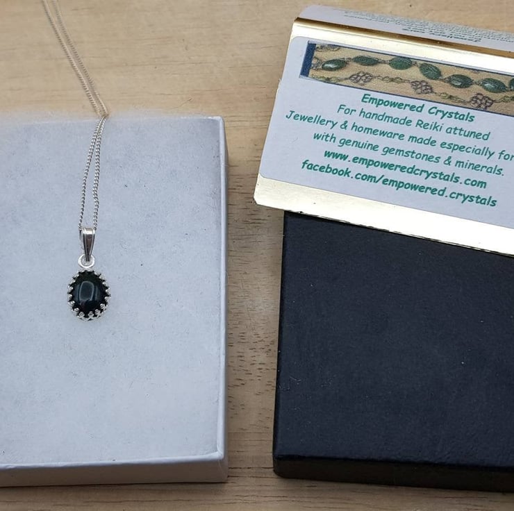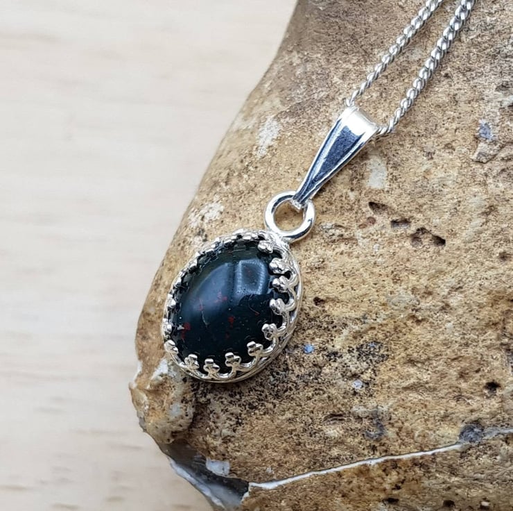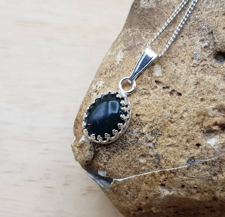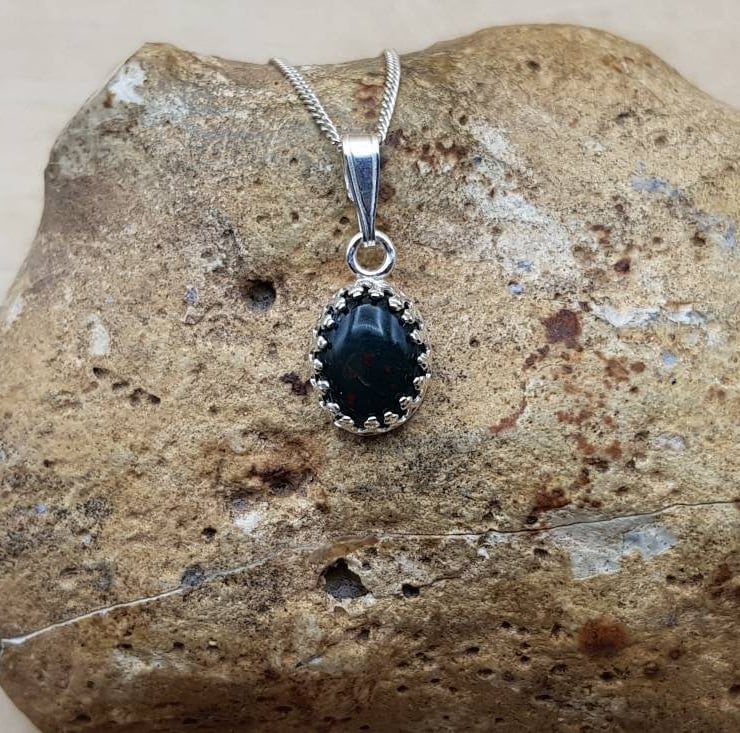 This is a tiny, delicate sterling Silver green bloodstone pendant necklace.