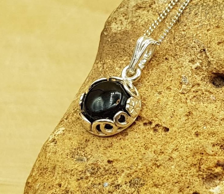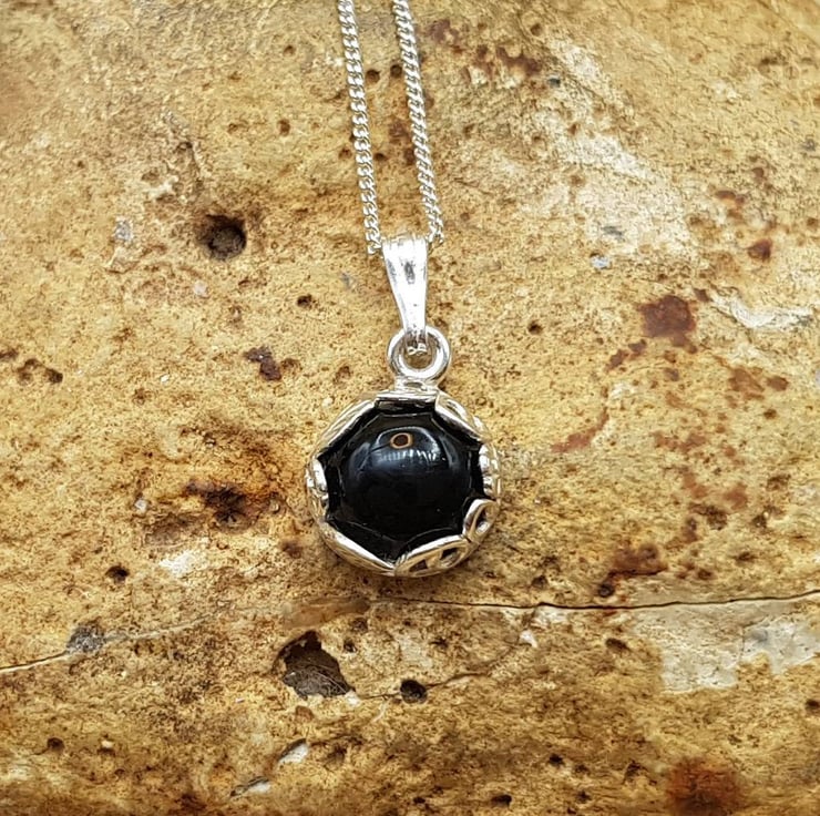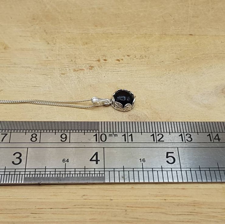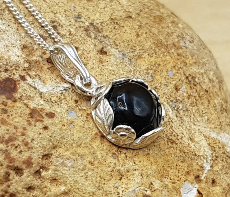 This is a tiny minimalist round black obsidian pendant with sterling silver necklace with flower leaf edging.