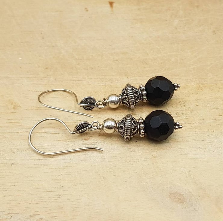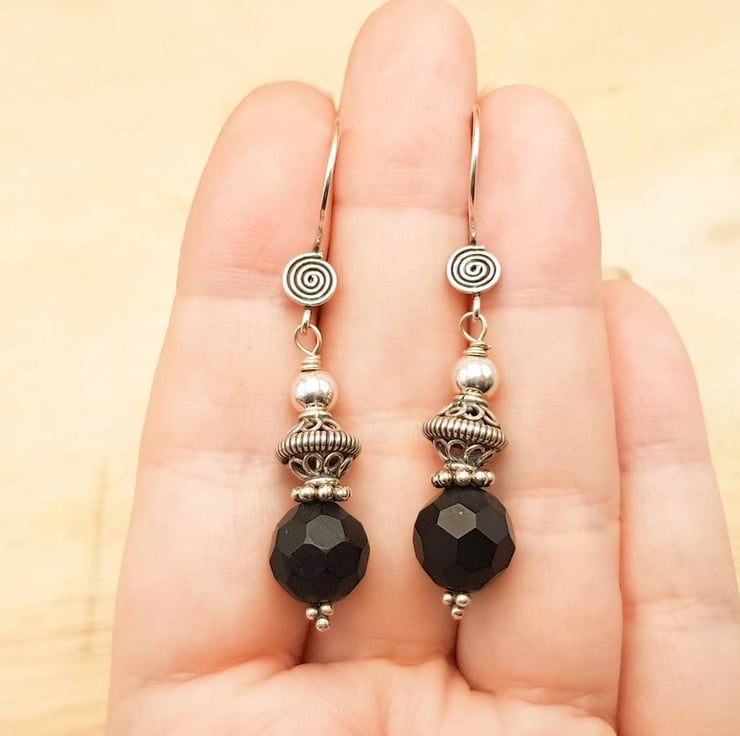 These are black onyx earrings. Wire wrapped with Bali silver beads. Bali silver beads are handmade by the renown silversmiths of Bali and contains up to 99% silver. Bali silver is not hallmarked or stamped.