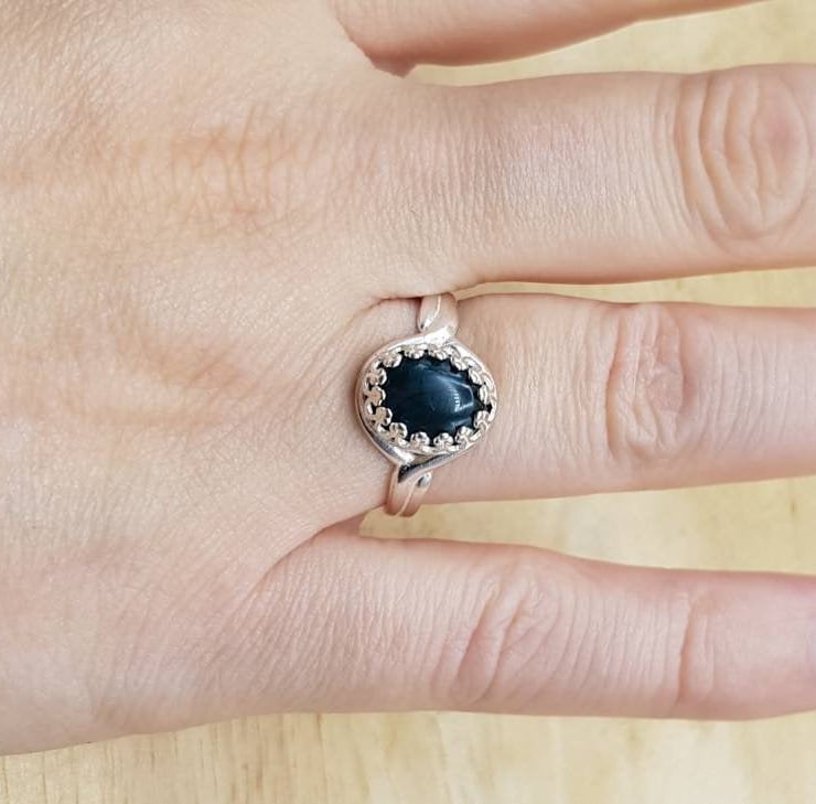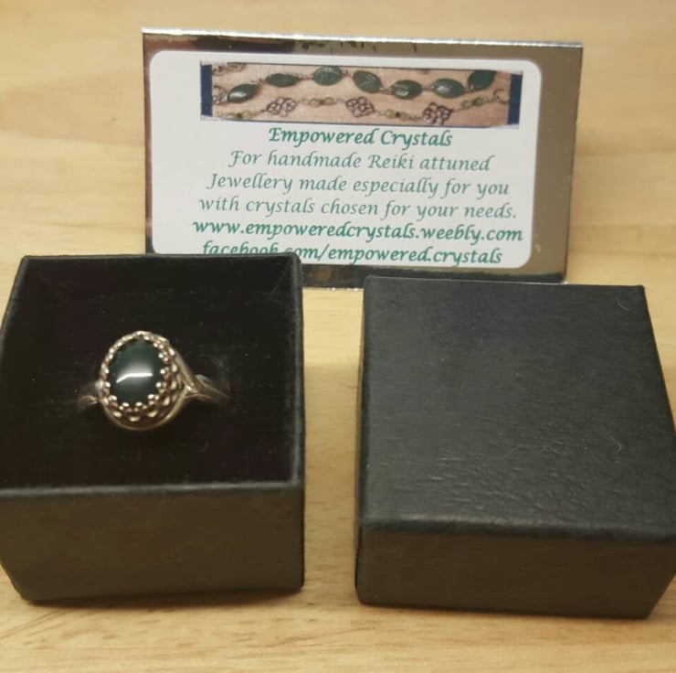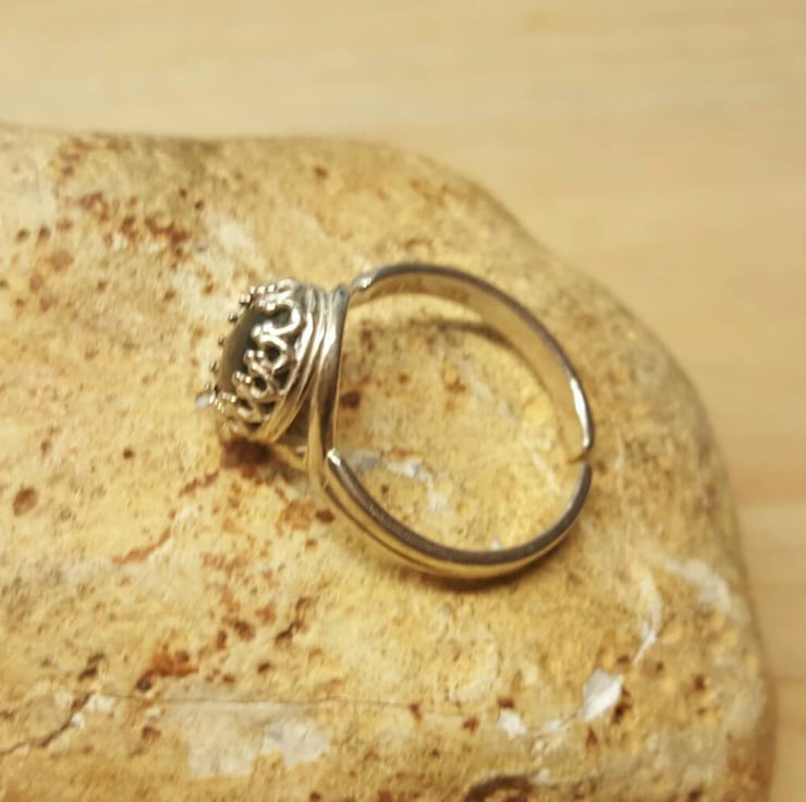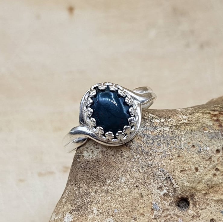 This is a lightweight sterling Silver dark green bloodstone adjustable ring with crown edging. Stones will vary from the photos.