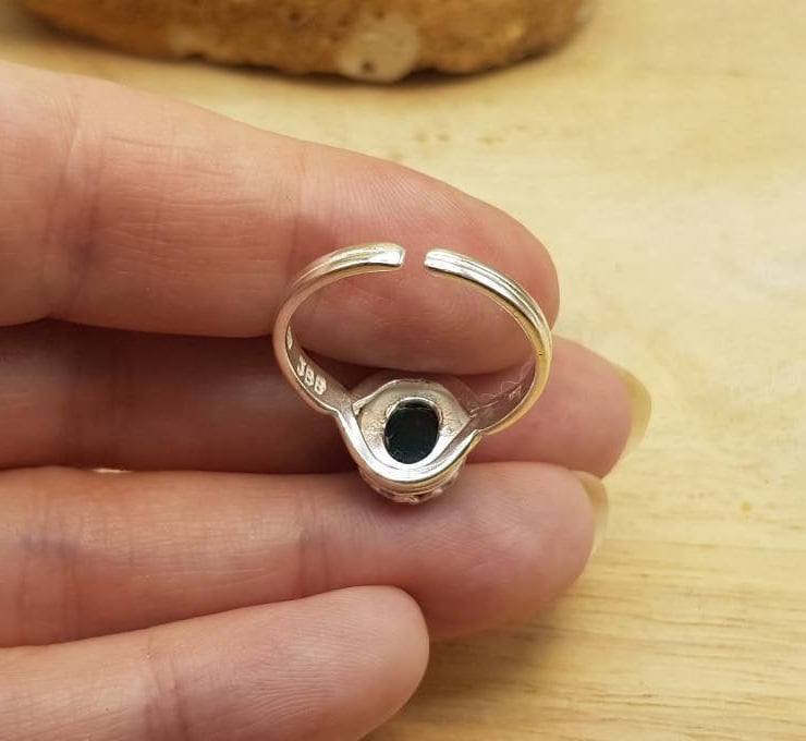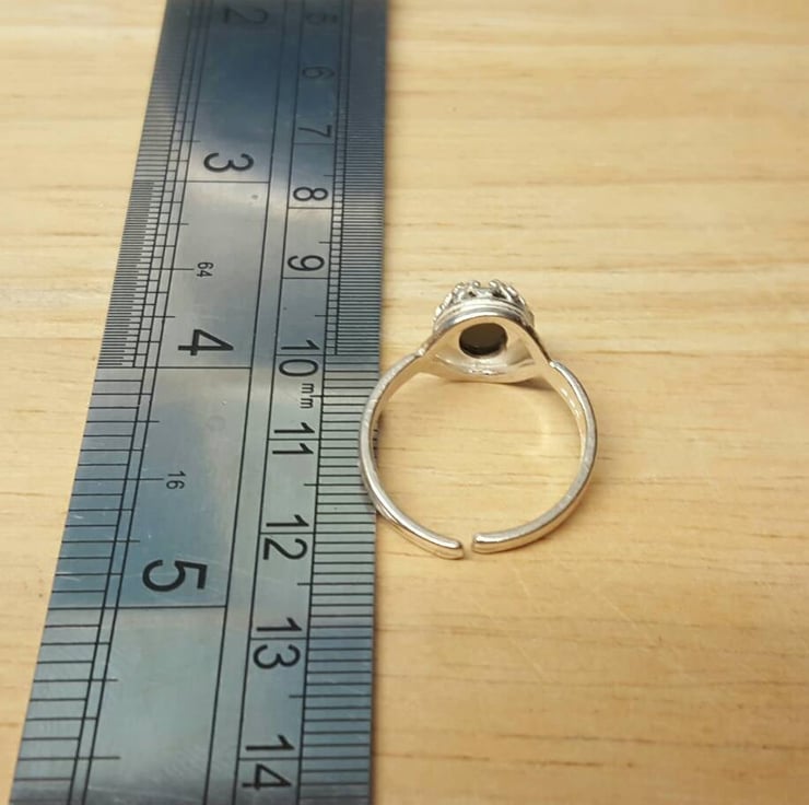 Sterling Silver ring is adjustable so should fit most ring sizes.