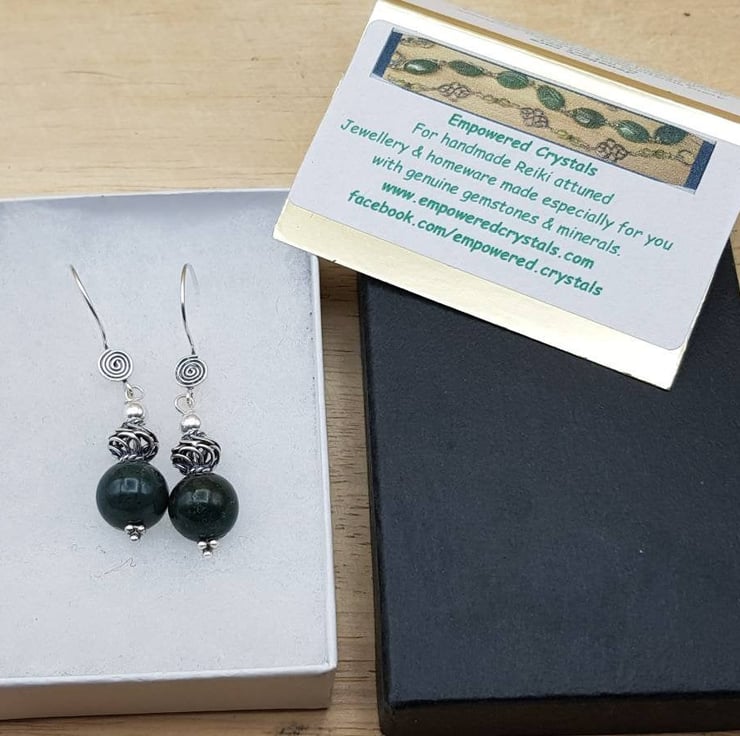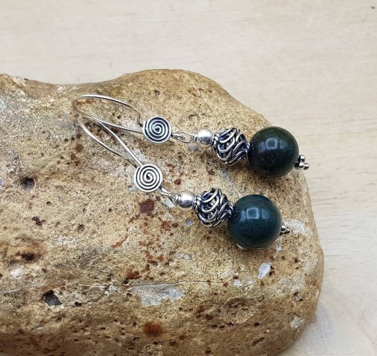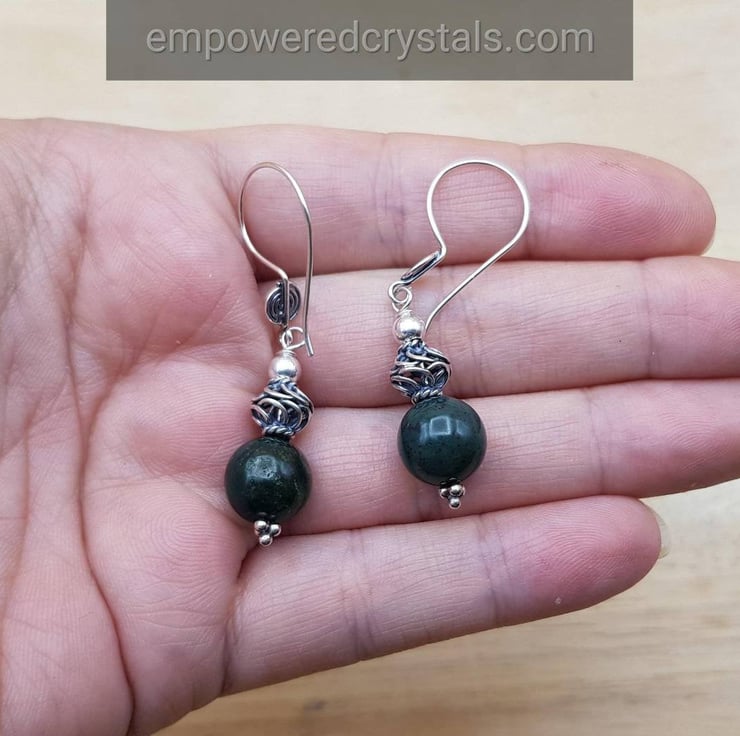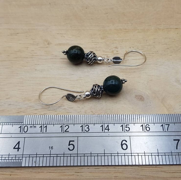 These are sterling Silver dark green bloodstone dangle earrings that I have made with Bali silver beads which are handmade beads by the world renown silversmiths of Bali that contain up 99% silver. Bali Silver is not hallmarked or stamped.