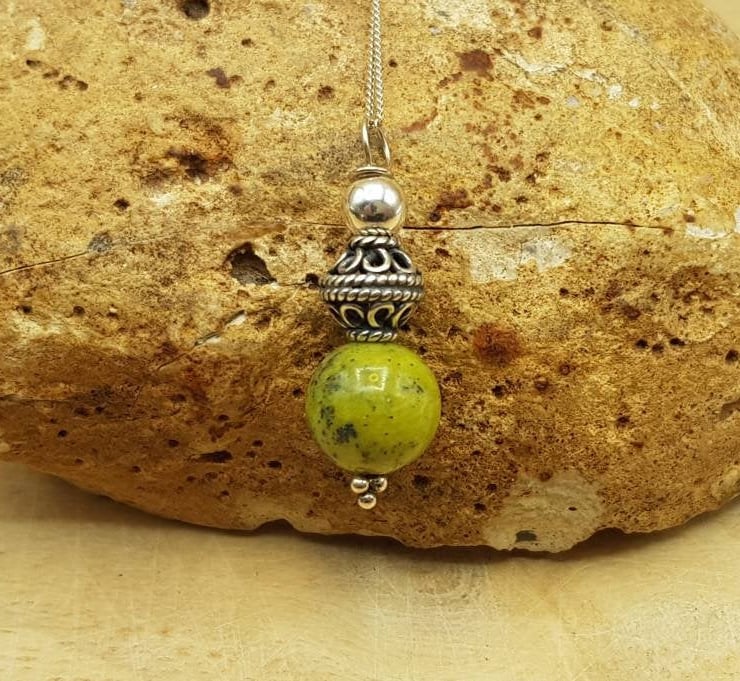 This is a women's small Chrysoprase pendant necklace made with Bali silver beads which are handmade beads by the world renown silversmiths of Bali and contains up to 99% silver but is not hallmarked or stamped.