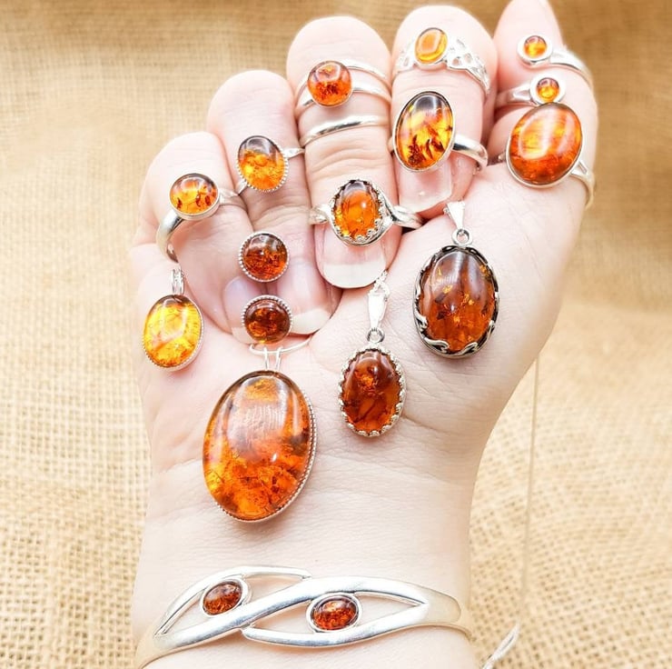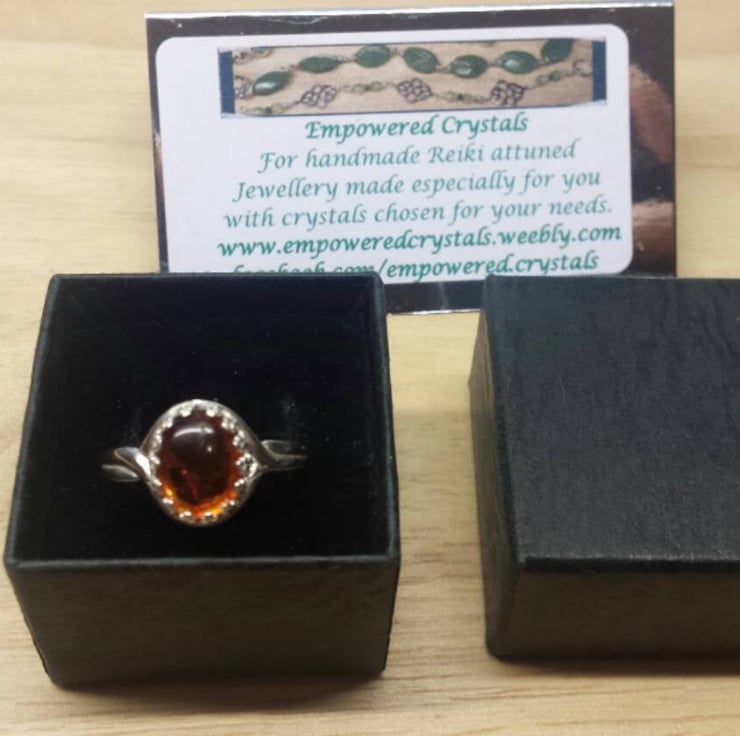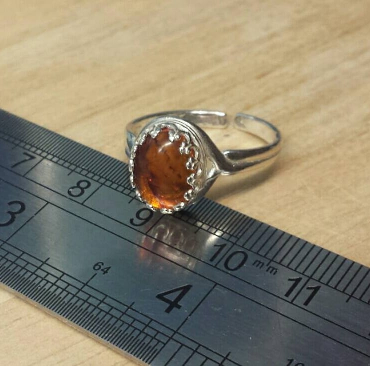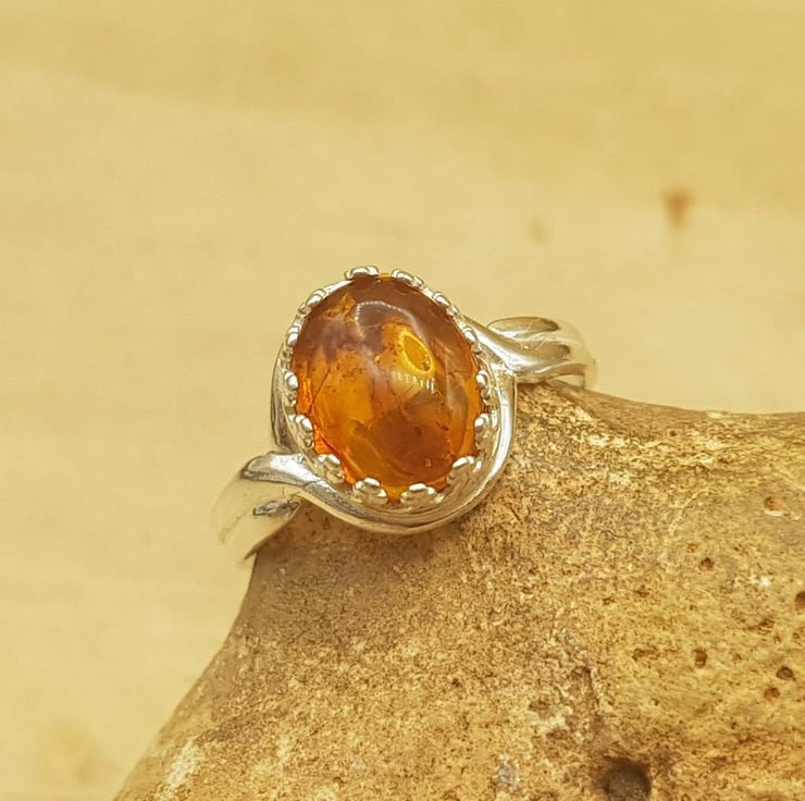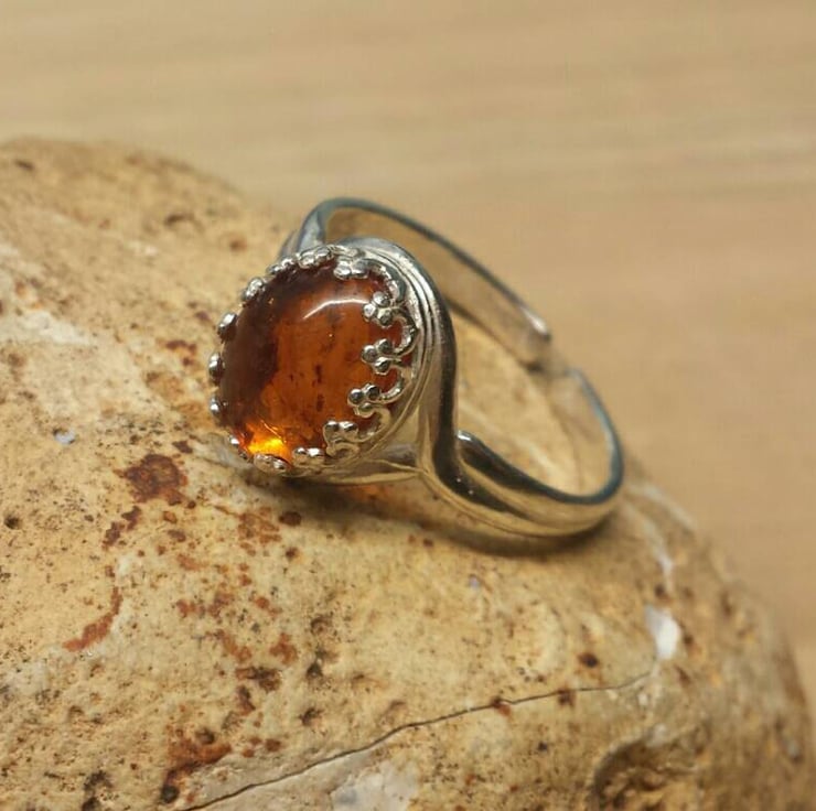This is a women's lightweight sterling silver Russian pressed amber ring with crown edging. Amber is actually a resin and not a mineral and so is warm to touch instead of cold like most stones. Amber will vary from the photos.
