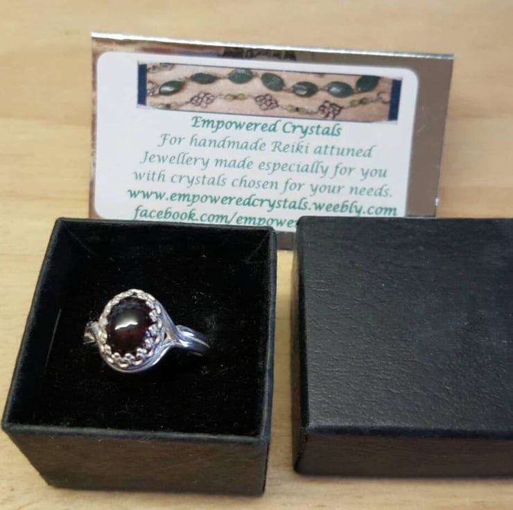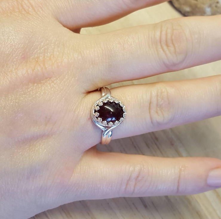 This is a women's lightweight Sterling silver oval dark red garnet adjustable ring with crown edging.