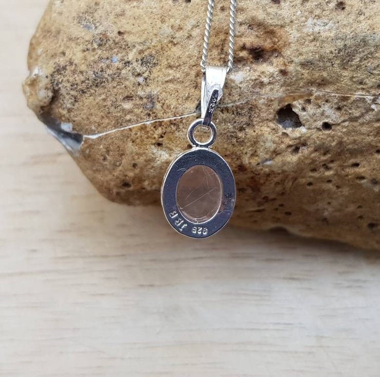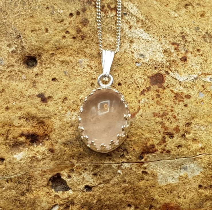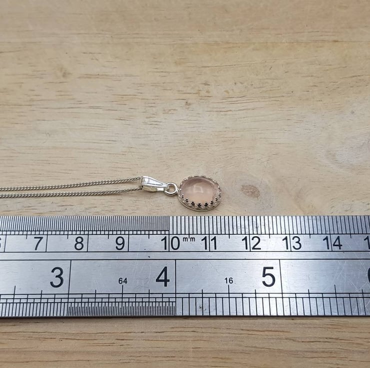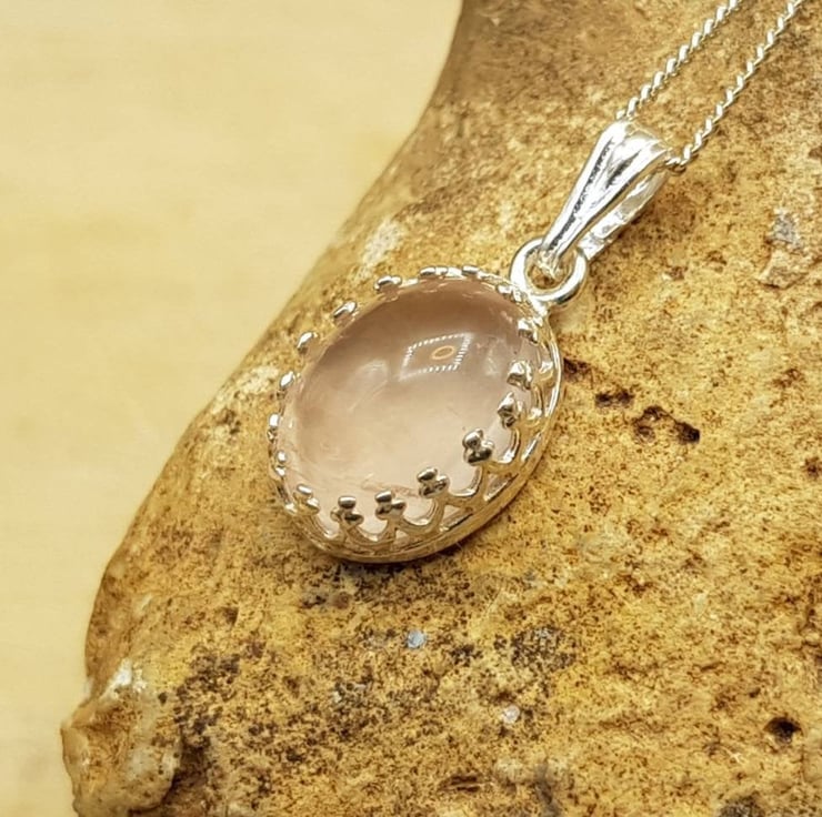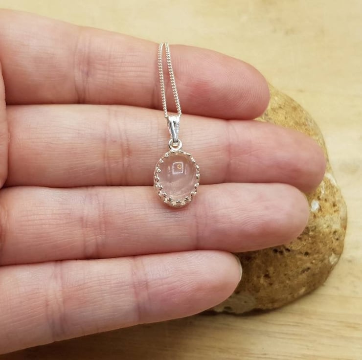 This is a women's tiny, delicate sterling silver oval Rose Quartz pendant necklace with crown edging.