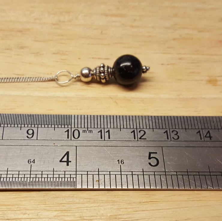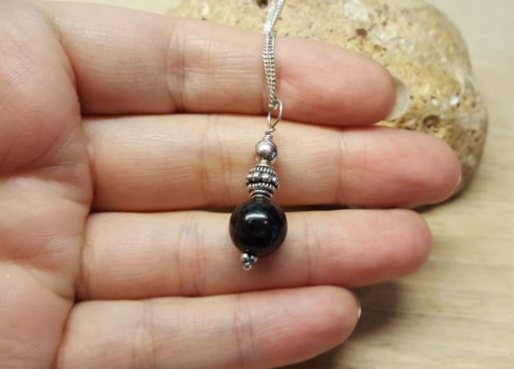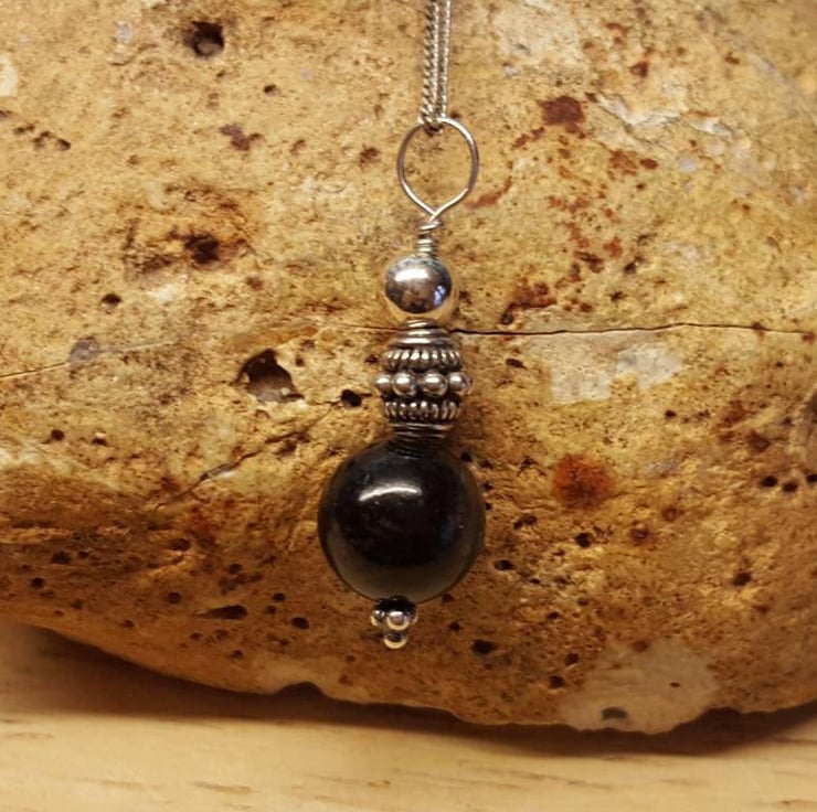This is a small, delicate Bali silver Arfvedsonite pendant with Bali silver beads which are handmade beads by the world renown silversmiths of Bali and contains up to 99% silver but is not hallmarked or stamped.