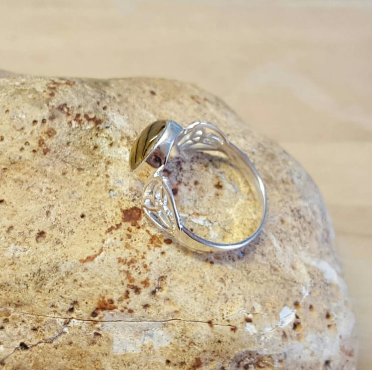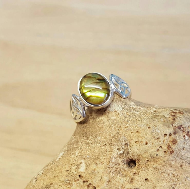 Natural Green Abalone triquetra Celtic knot ring. UK Size M