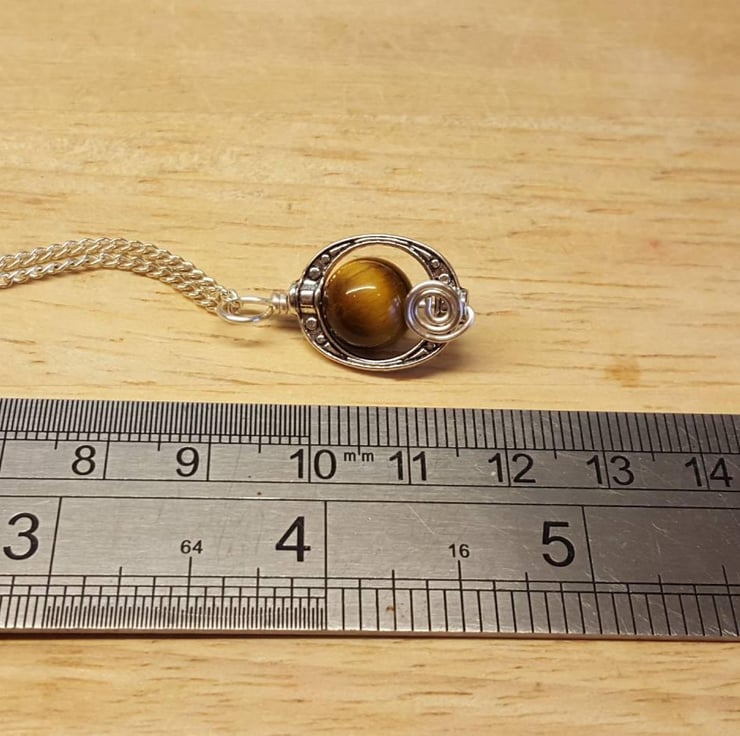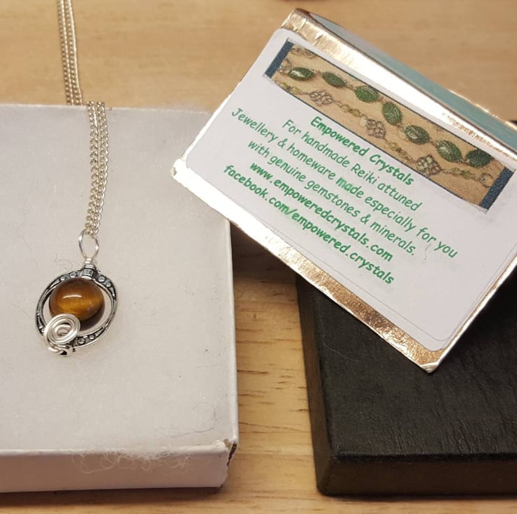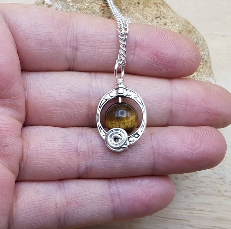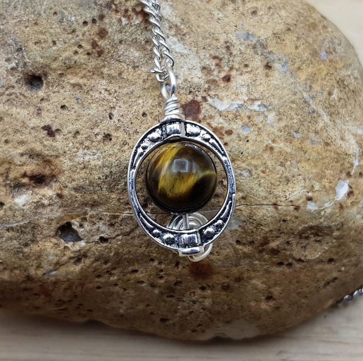 This is a women's minimalist Tiger's eye pendant necklace. Wire wrapped with silver plated copper wire within a frame.