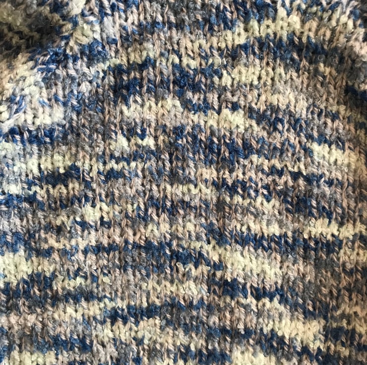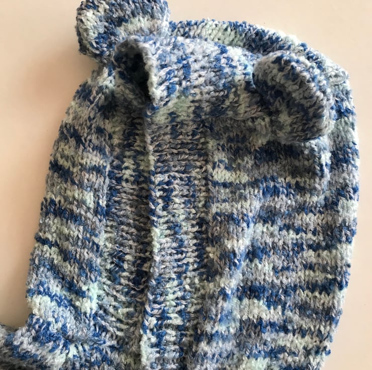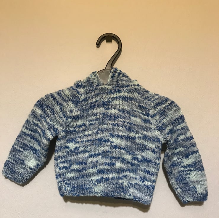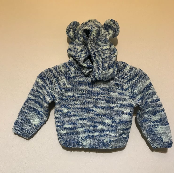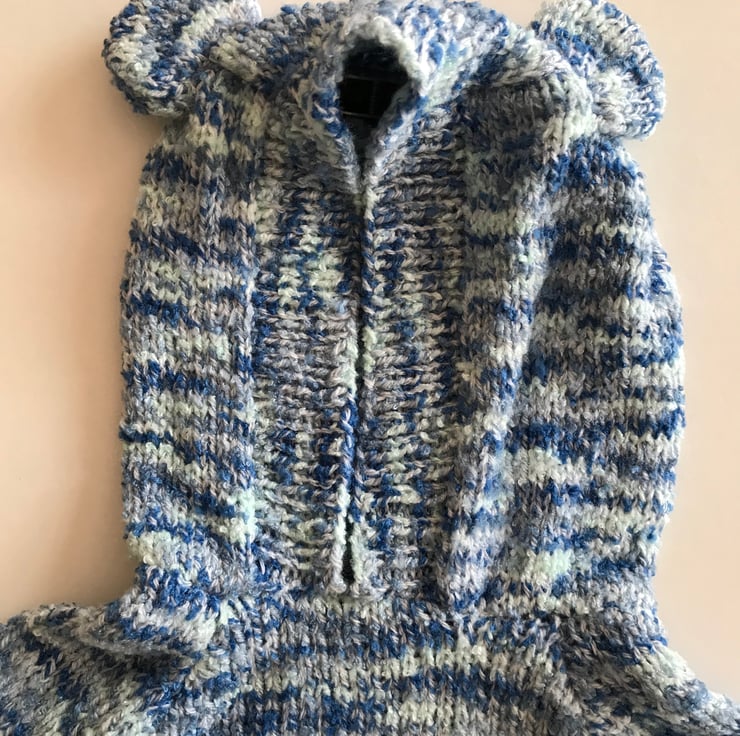 The hooded jumper is hand knitted in a lightweight, textured baby yarn. The yarn is variegated in shades of blue which gives it an uneven stripe appearance. The hood has ears attached, making it super cute.