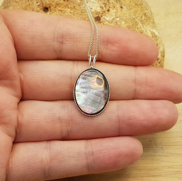 This is a women's simple oval sterling silver black lip mother of pearl pendant necklace. Pearl will vary from the photos.