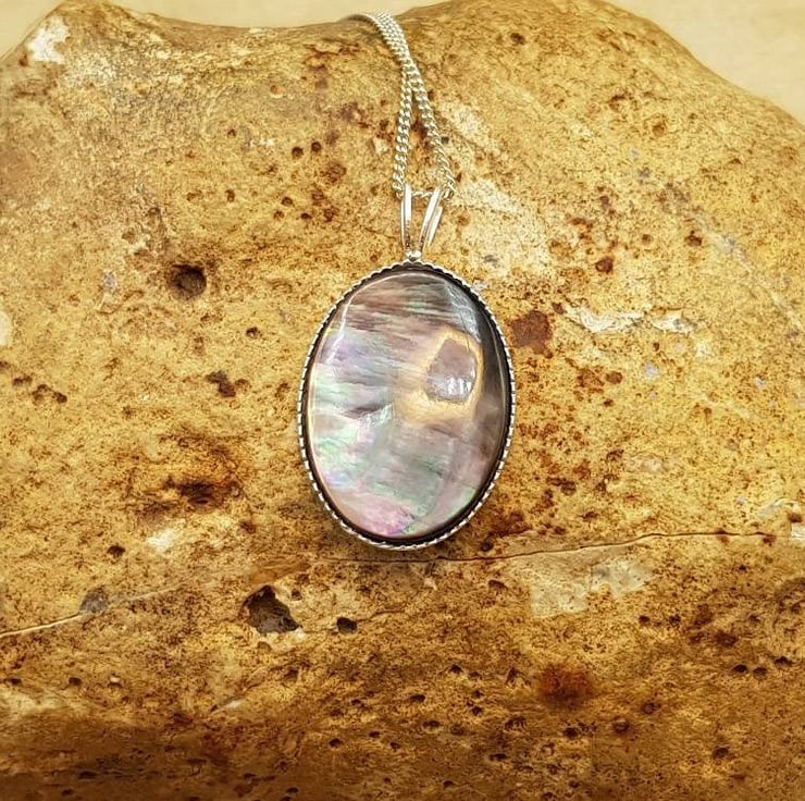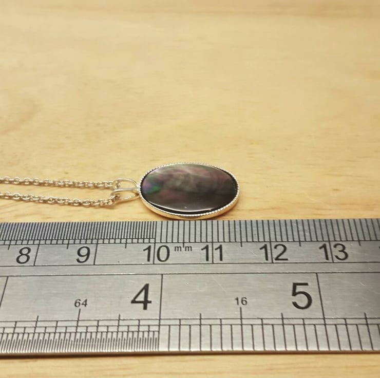 This is a women's simple oval sterling silver black lip mother of pearl pendant necklace. Pearl will vary from the photos.