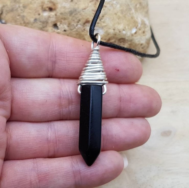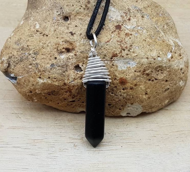 This is a silver plated black obsidian pendant. Wire wrapped with silver plated copper wire.