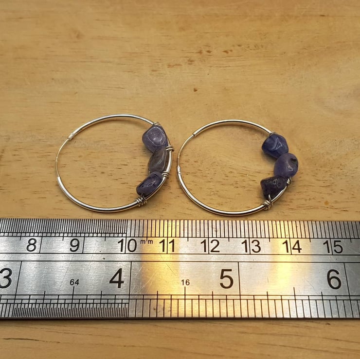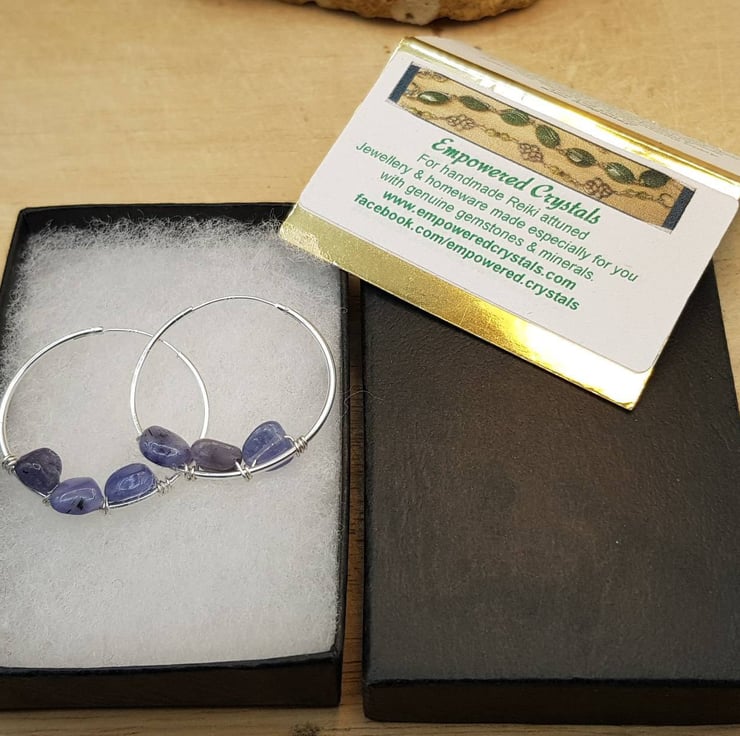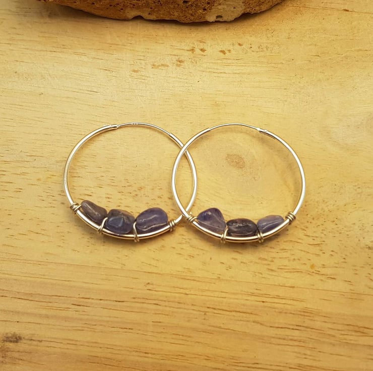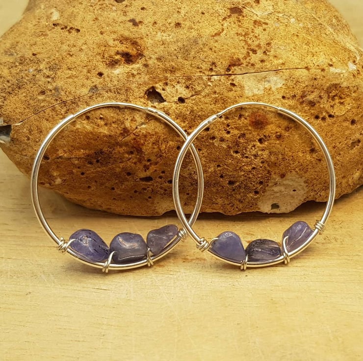These are women's 925 sterling silver genuine Tanzanite sleeper hoop earrings. I have wire wrap this with sterling silver wire. Stones and wire wrapping will vary from the photos.