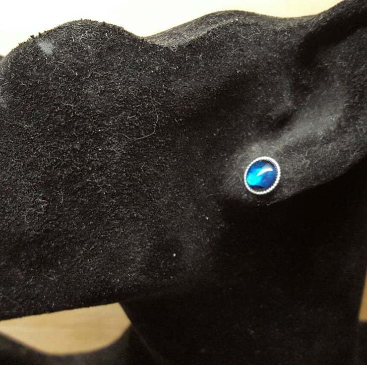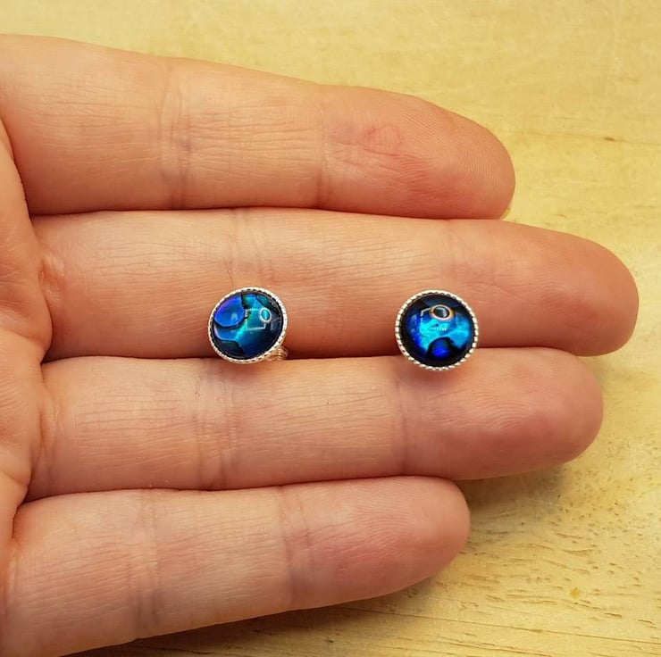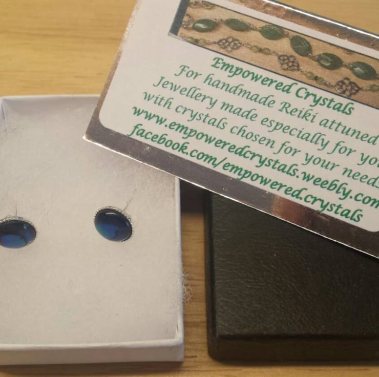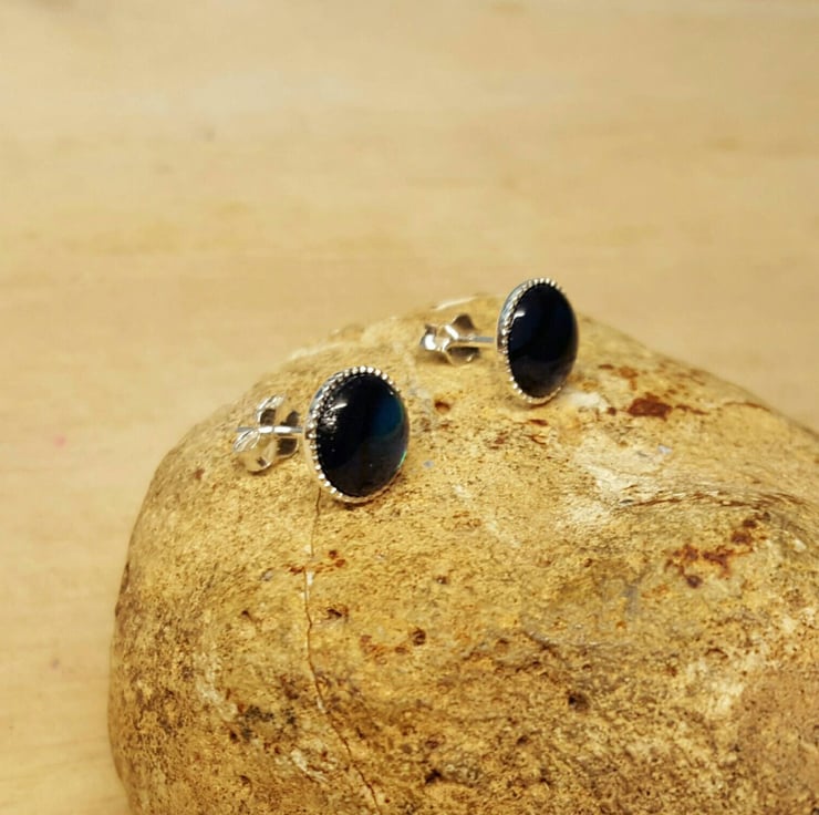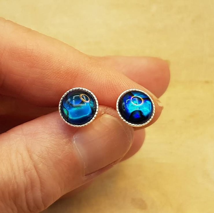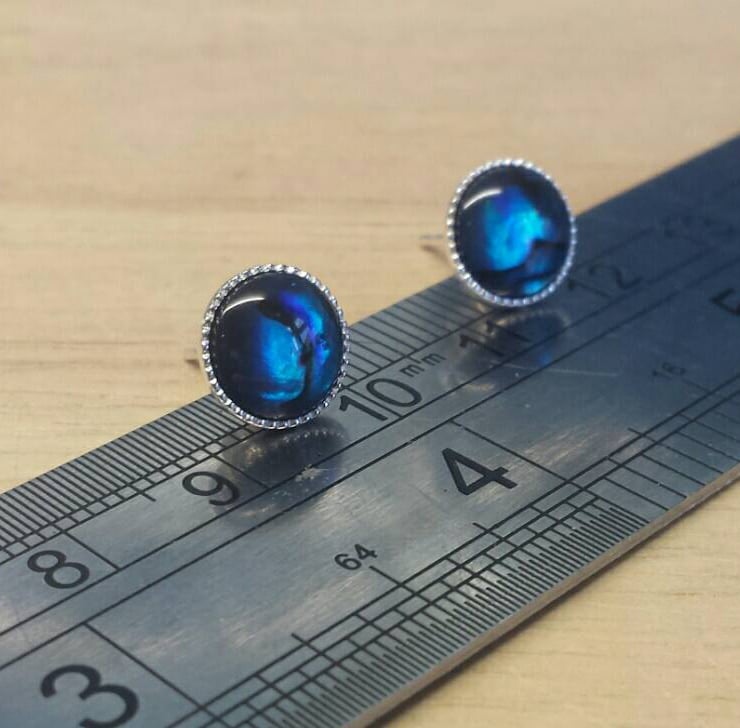 These are women's sterling silver round blue abalone stud earrings.