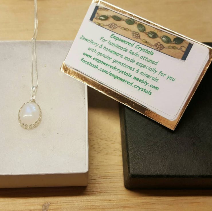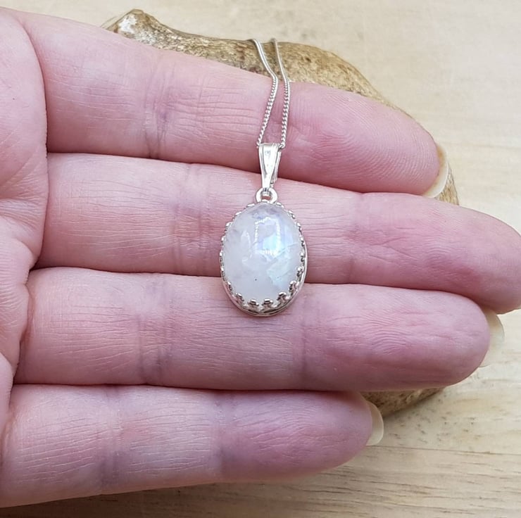 This is a small, delicate sterling silver Rainbow Moonstone Pendant.