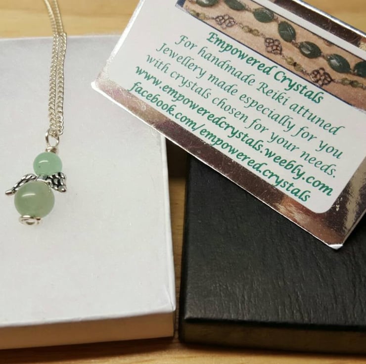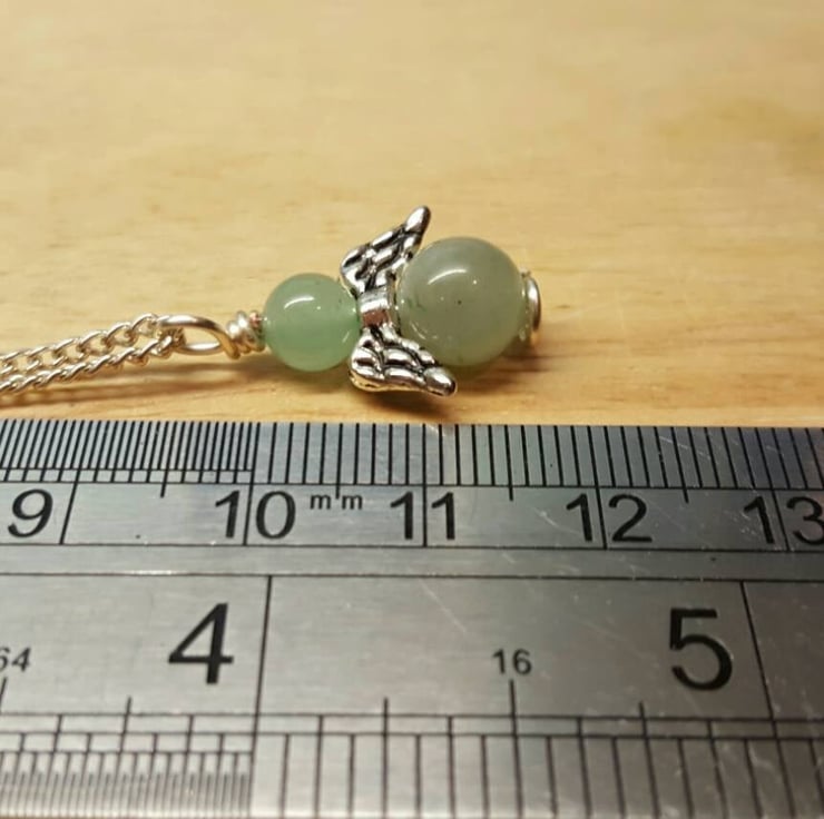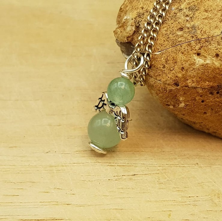 This is a small, delicate silver plated Green Aventurine angel Pendant, wire wrapped with silver plated wire and mounted onto silver plated chain.