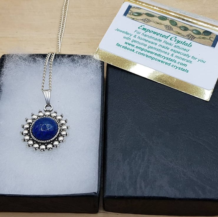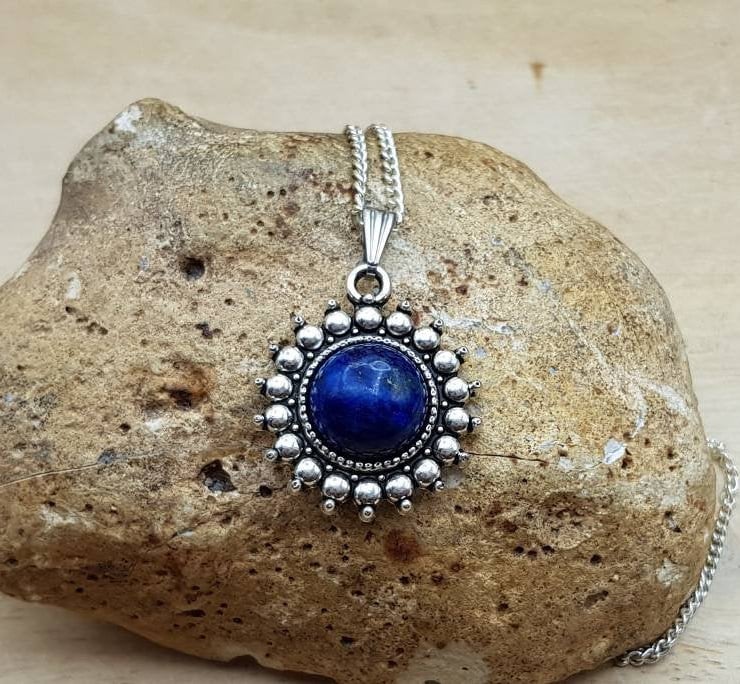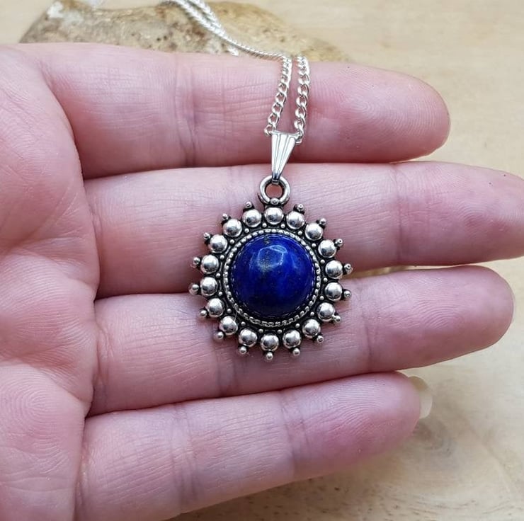 This is a silver plated boho round Lapis Lazuli pendant. This necklace would make a great September birthday present for women who love boho chic gemstone jewellery.