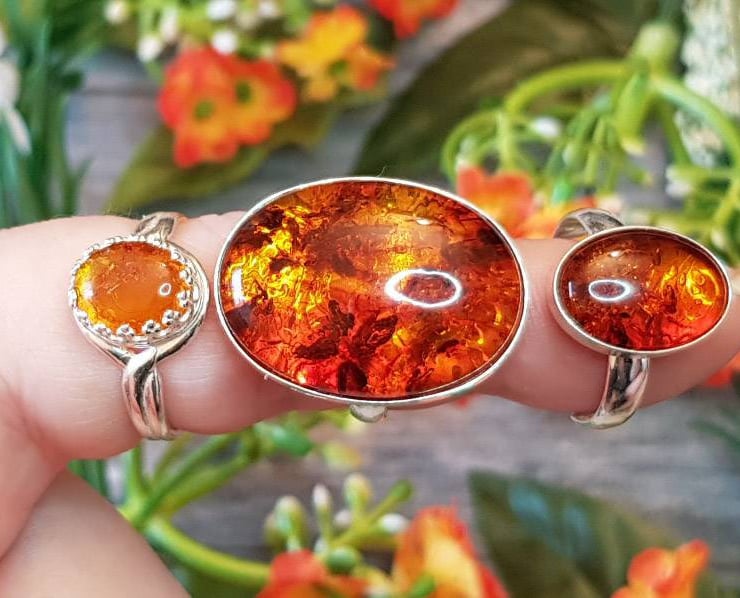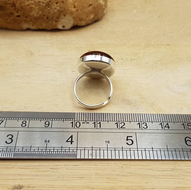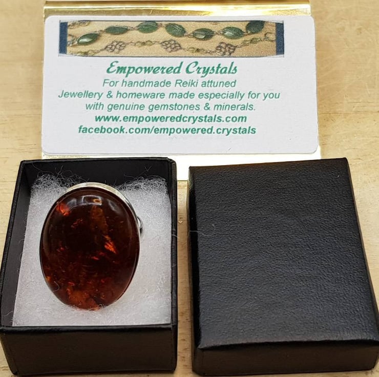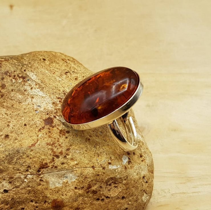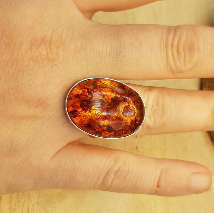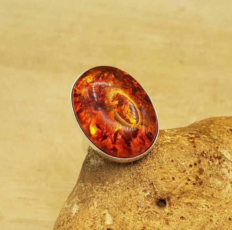 This is a sterling silver Russian pressed amber adjustable ring. Amber is actually a fossilised resin and not a mineral and so is warm to touch instead of cold like most stones and is very light in weight. AMBER WILL VARY FROM THE PHOTOS.