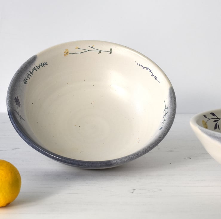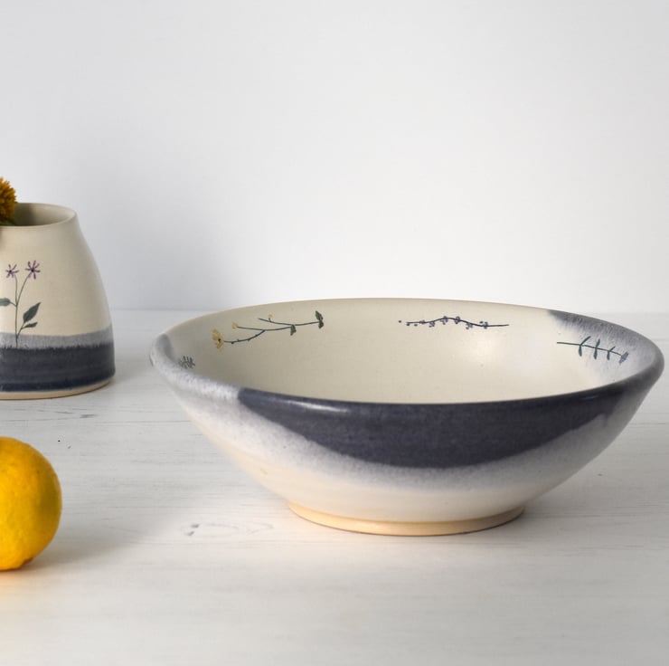 Handmade in our studio, the bowl is part of our Mendocino series of illustrated ceramics. It is glazed in white to midnight blue with a powdery blue finish where the two colours overlap. The flowers, hand-drawn by Zanna, were inspired by plants growing wild on the coast of Northern California. Fused deep into the glaze during a third high temperature firing, these images are there to stay. Our maker's mark can be found on the base.