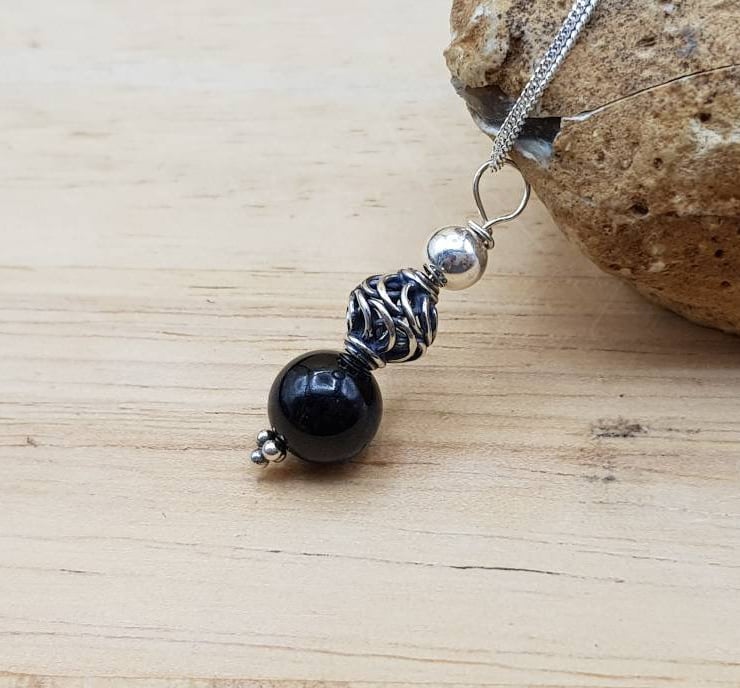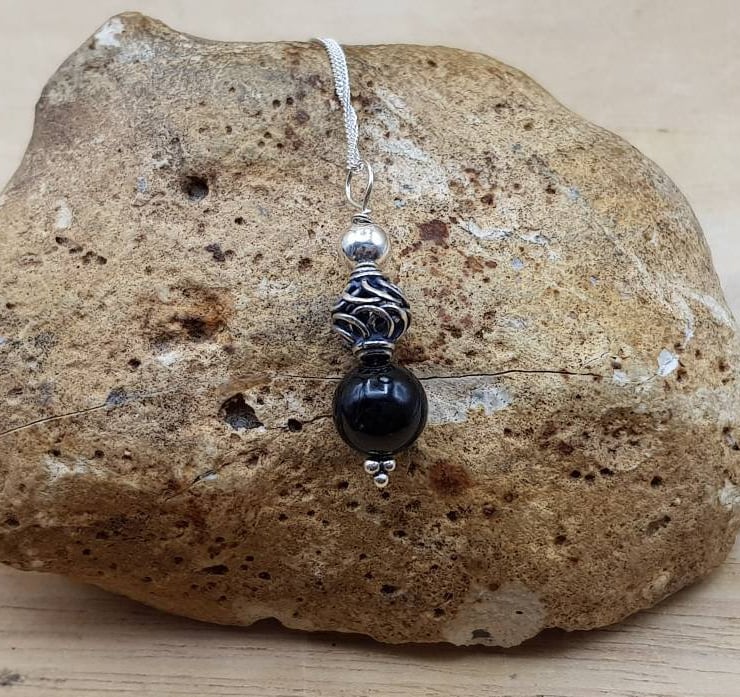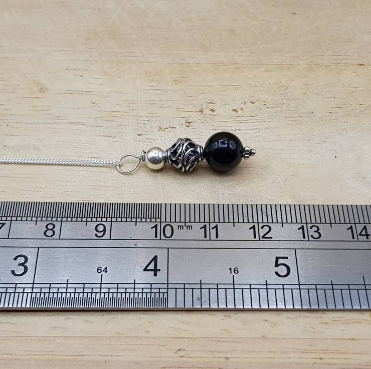 This is a small delicate Bali silver dark black spinel pendant necklace. Bali silver beads are handmade by the renown silversmiths of Bali and are up to 99% silver. Bali Silver is not stamped or hallmarked.