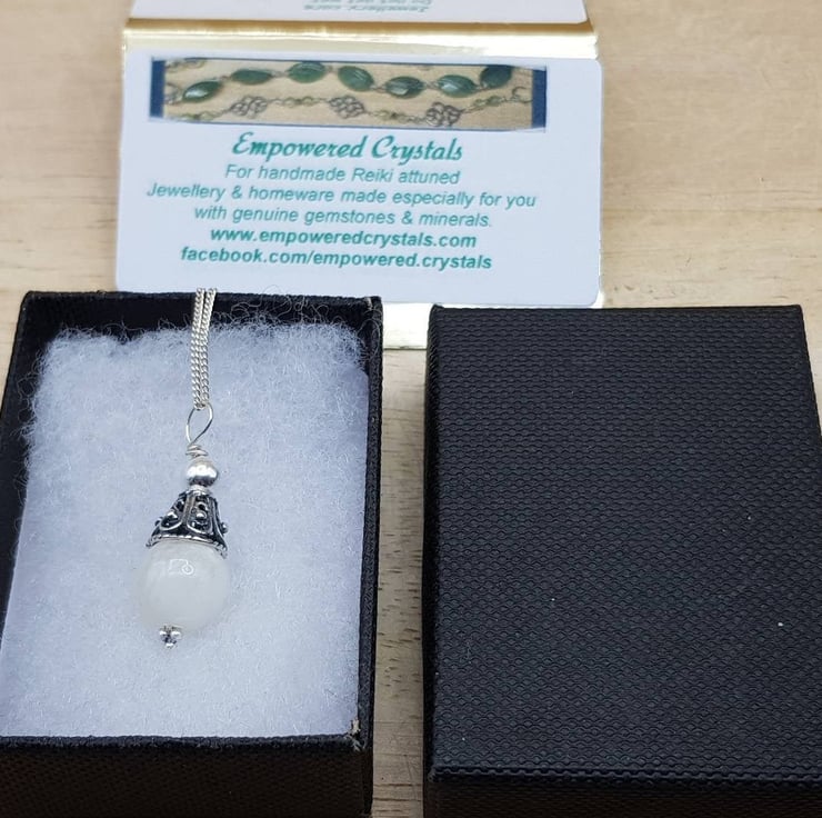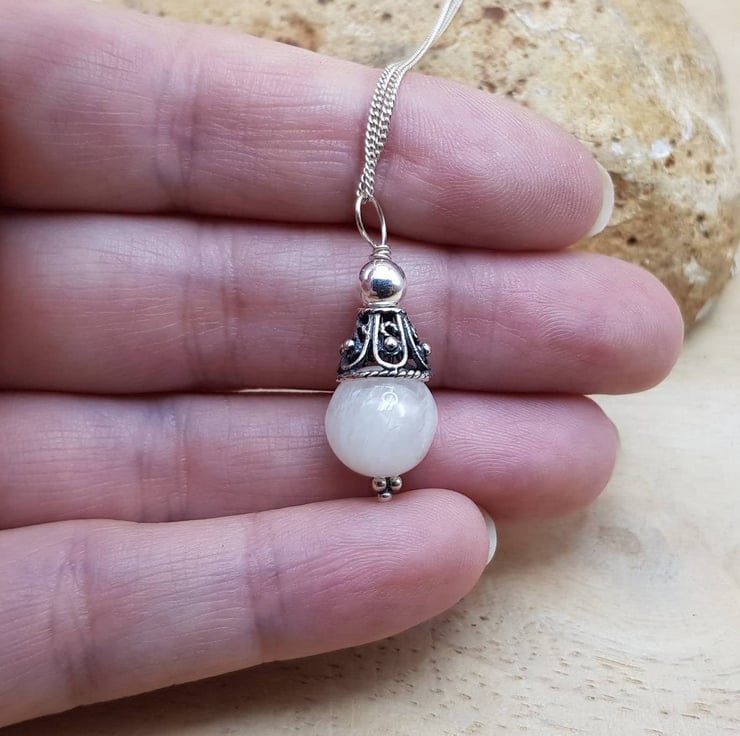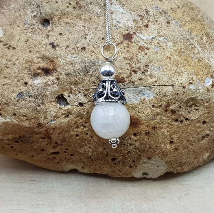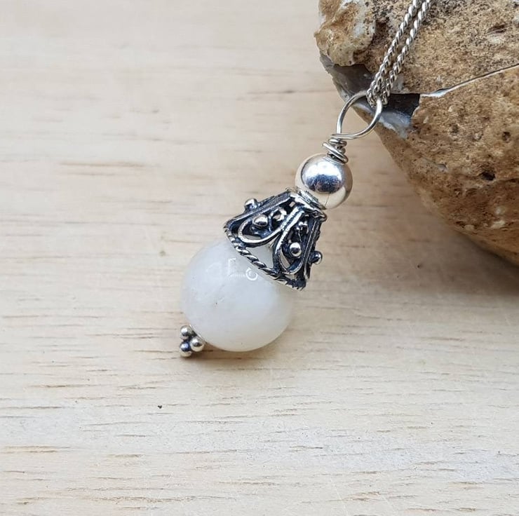 This is a Bali silver white Moonstone cone Pendant Necklace, ideal for a June birthstone for women that love unique handmade minimalist gemstone jewellery. I have made this with Bali Silver beads which are handmade beads by the world renowned silversmiths of Bali that contain up to 99% silver. Bali Silver is not hallmarked or stamped.