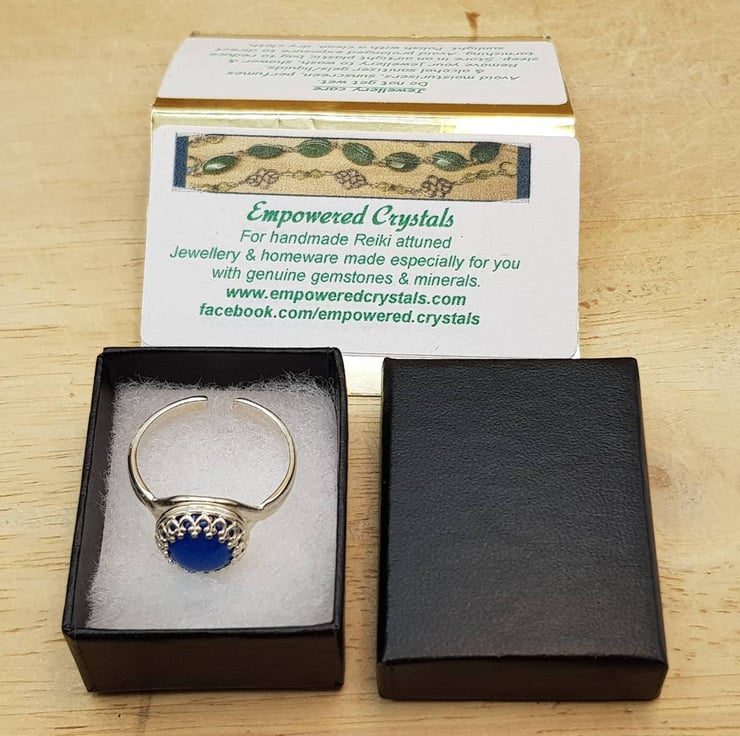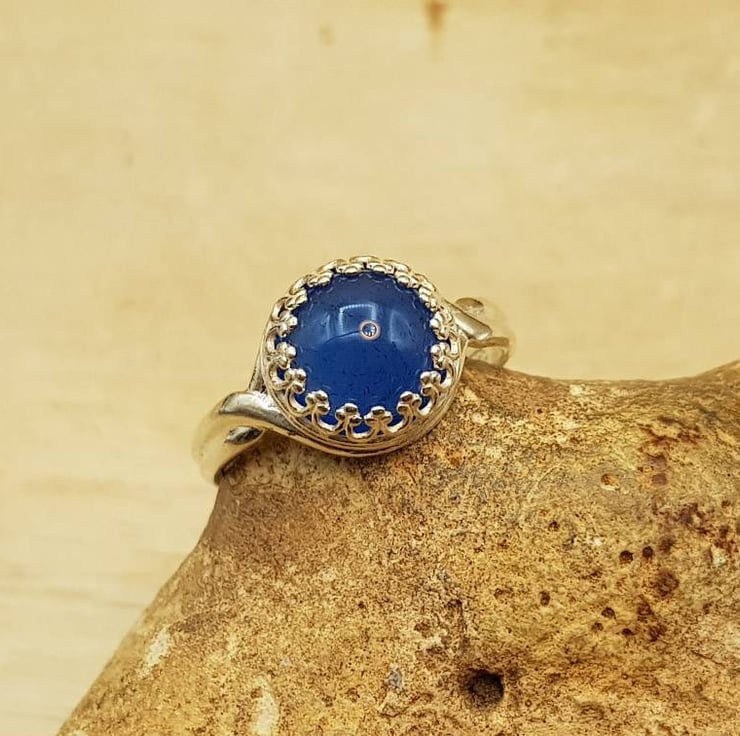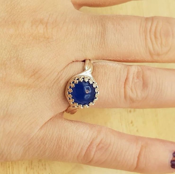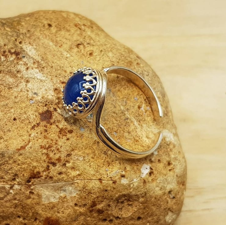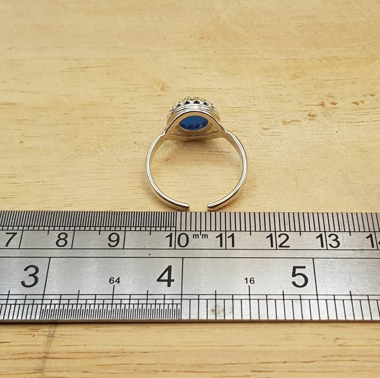 This is a women's simple oval sterling silver blue Onyx adjustable ring with crown edging.