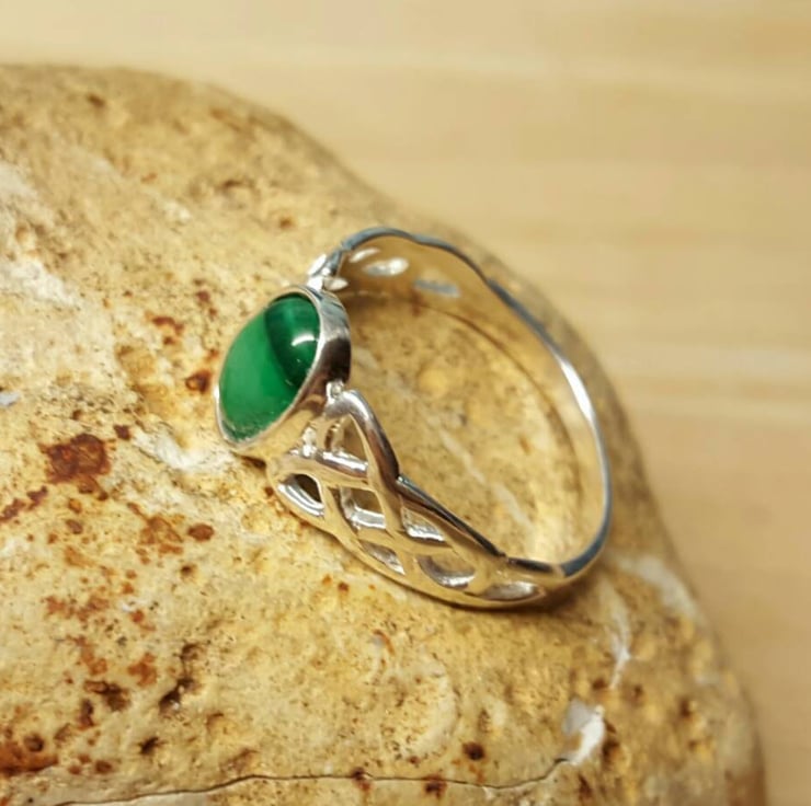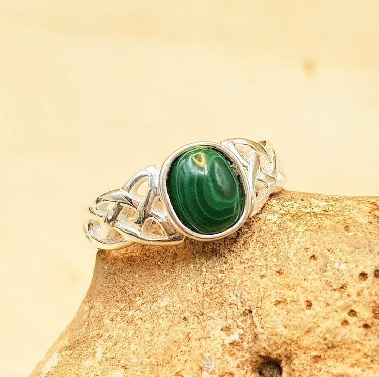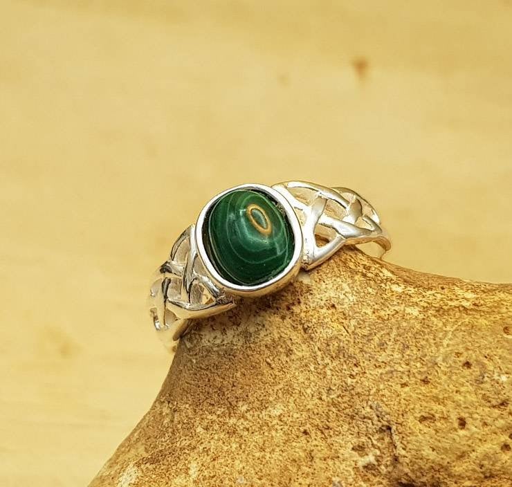 This is a women's lightweight sterling silver Malachite Celtic knot ring.