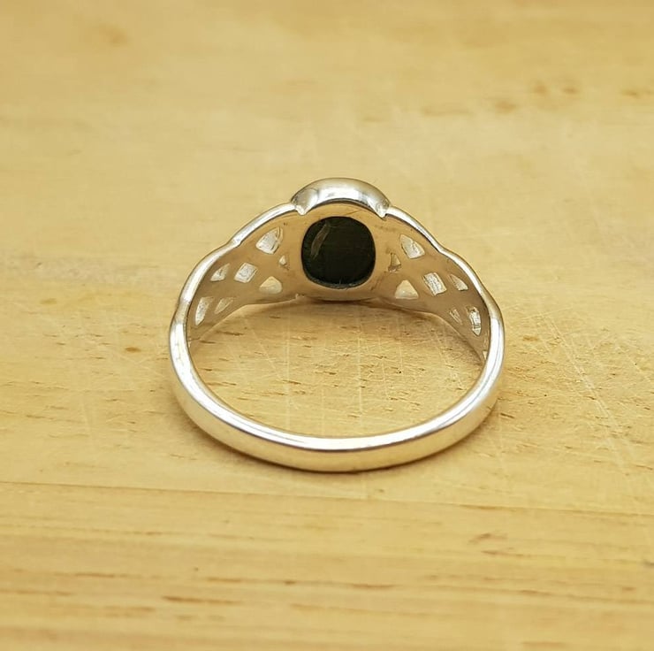 This is a women's lightweight sterling silver Malachite Celtic knot ring.