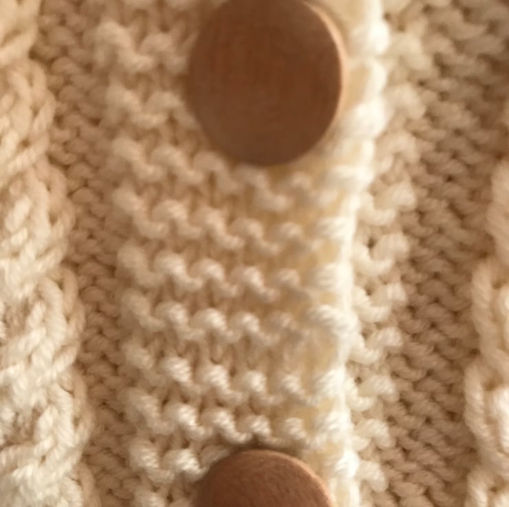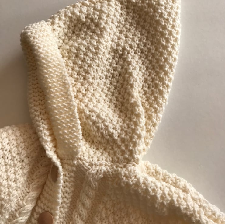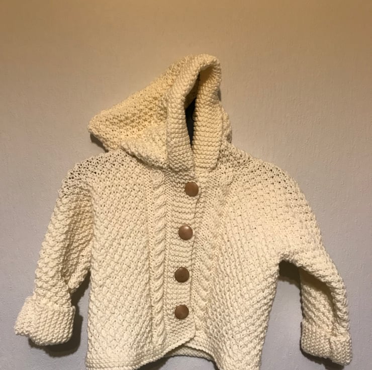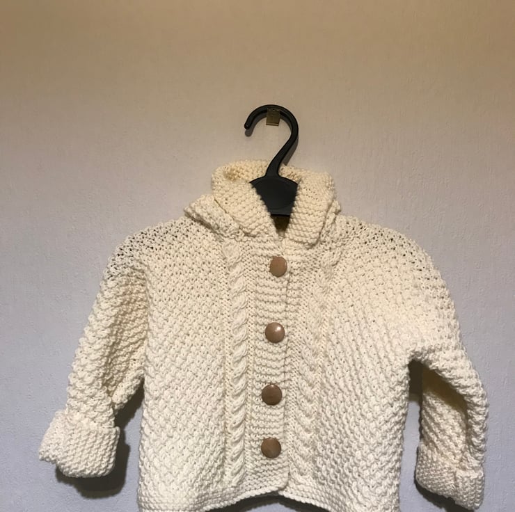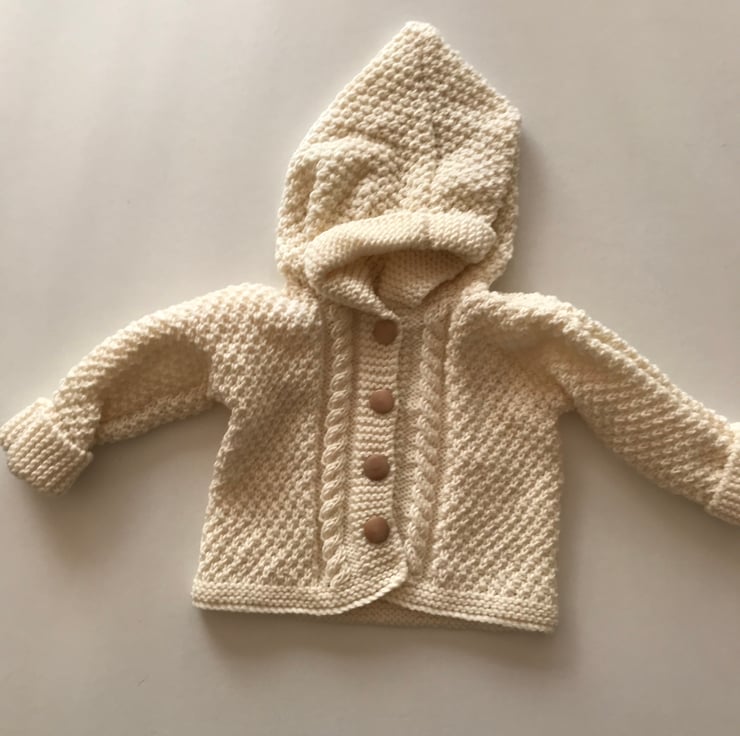 This beautiful hand knitted baby jacket is knitted in a soft baby wool. It is knitted in moss stitch which gives it a textured look and has cable panels at the front. It has a pixie style hood with a folded back brim and the sleeve cuffs are also folded over. It has four mock wooden buttons to fasten it.