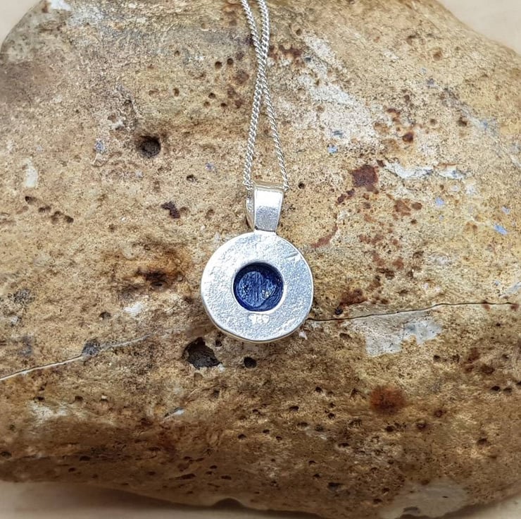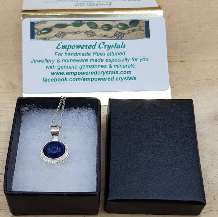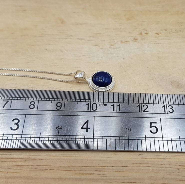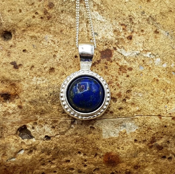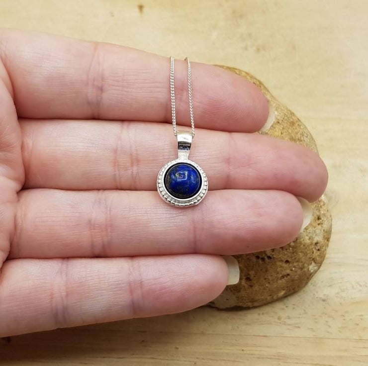 This is a tiny, delicate sterling silver Lapis Lazuli round pendant necklace with studded edge.