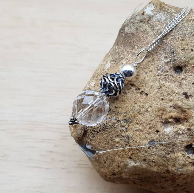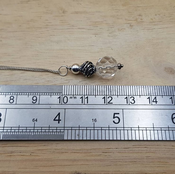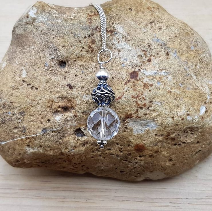 This is a Bali silver clear Quartz pendant necklace. Bali Silver beads are handmade beads by the world renown silversmiths of Bali that contain up to 99% silver. Bali Silver is not hallmarked or stamped.