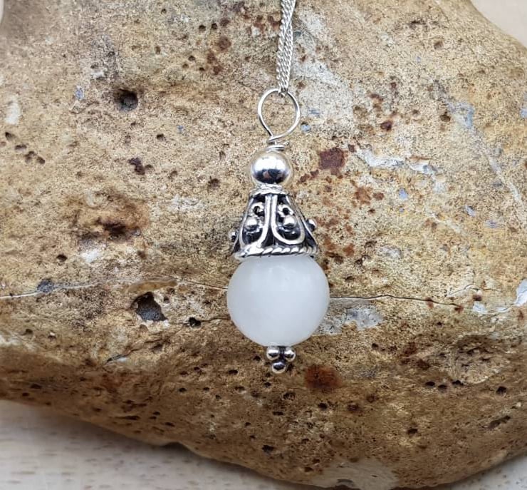 This is a Bali silver selenite pendant. Bali silver beads are handmade beads by the world renown silversmiths of Bali and contains up to 99% silver but is not hallmarked or stamped.