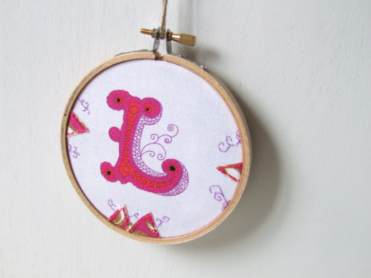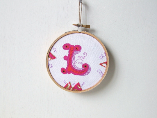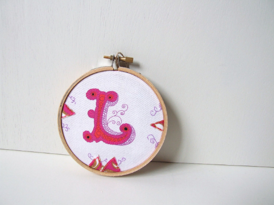 L is for love. This embroidery hoop shows a capital letter L in a circus type font. The fuchsia pink and orange graphic would work well in a little girl's room or a room with a circus theme. It’s equally at home on a shelf or hanging on a wall.
