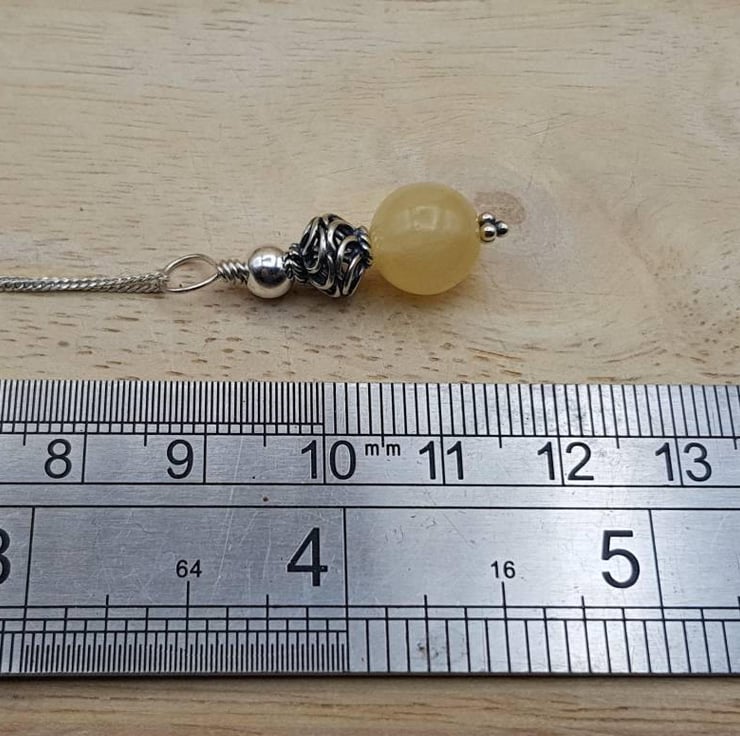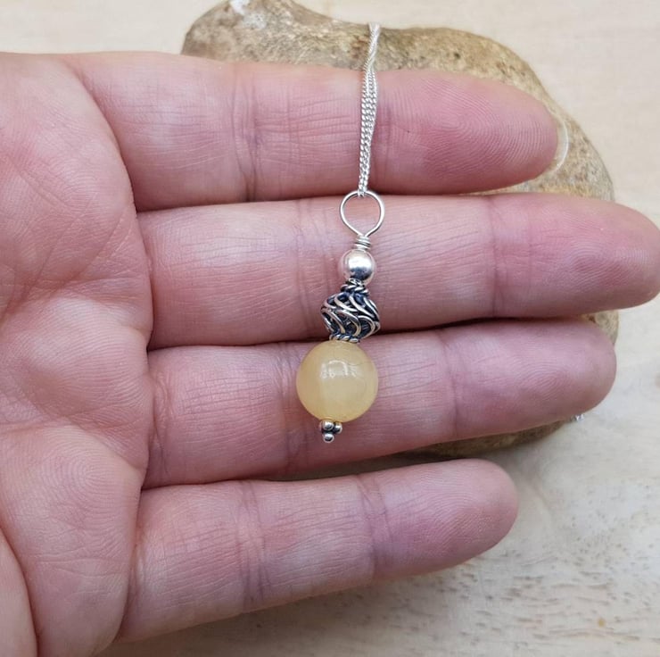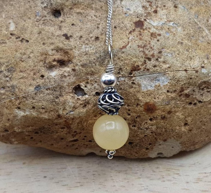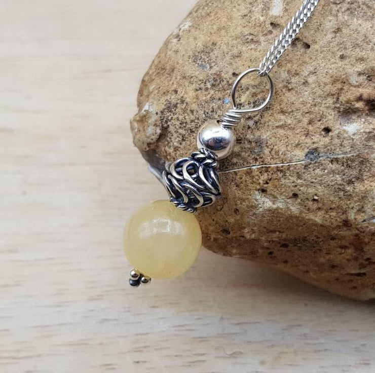 This is a women's minimalist small yellow calcite pendant necklace wire wrapped with Bali silver beads.